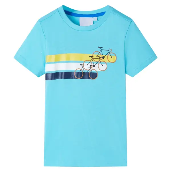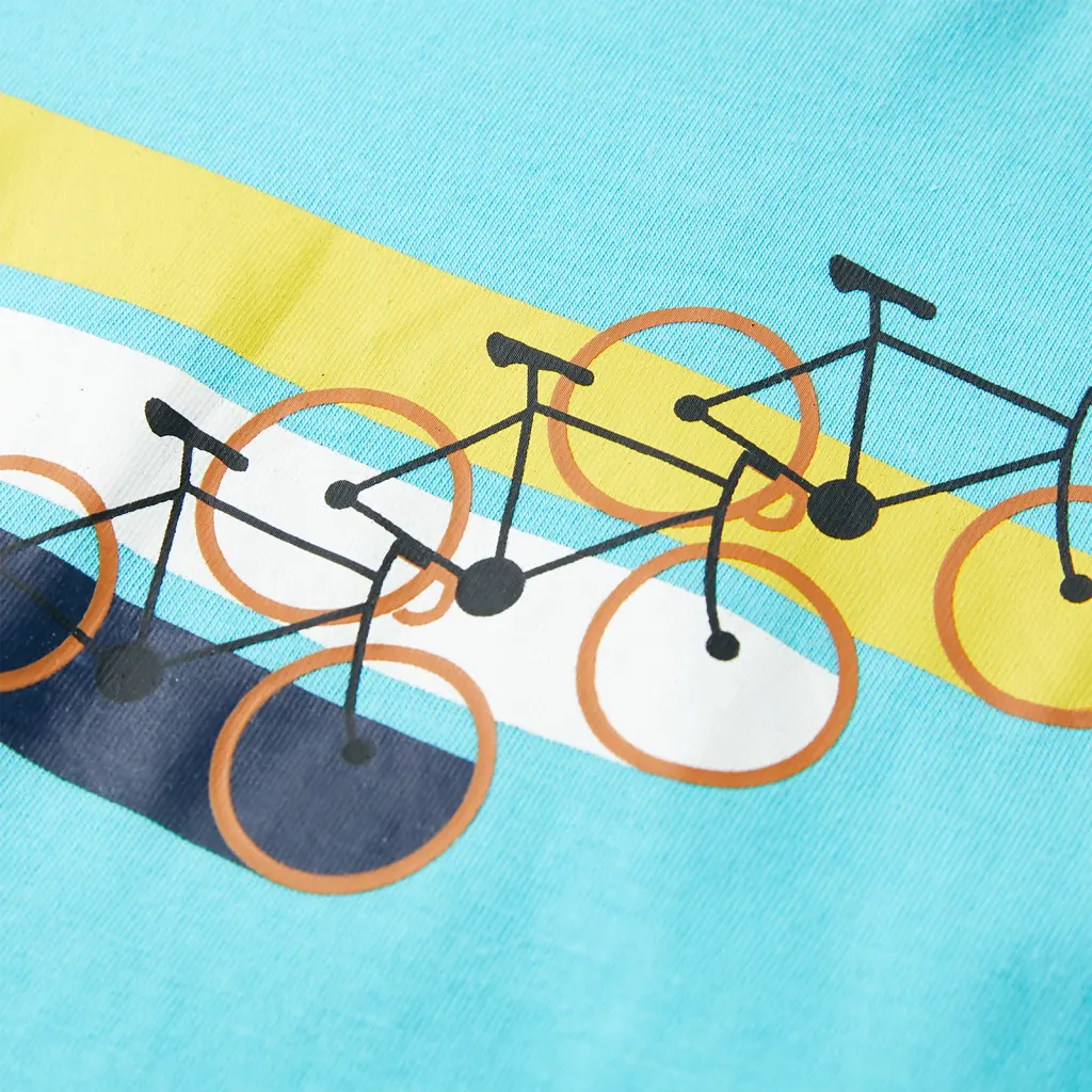 • Sinine värv jalgratta ja triipude trükiga – rõõmsameelne disain, mis meeldib lastele ja sobib hästi nii pükste kui lühikestega.