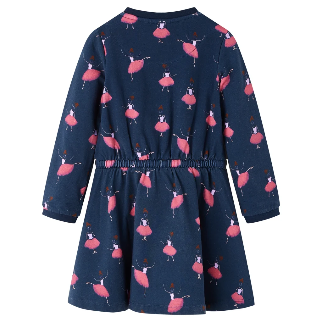 See tumesinine laste kleit baleriiniprindiga on loodud igapäevaseks kandmiseks 9–10-aastastele tüdrukutele. Pehmest puuvilla ja elastaani segust valmistatud kangas on nahasõbralik ja veidi veniv, pakkudes liikumisvabadust mänguks ja tegevusteks. Pingutusnööriga vöökoht võimaldab kleidi istuvust mugavalt kohandada.