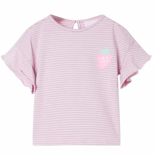 See lilla triibuline laste T-särk on mõeldud mugavaks igapäevaseks kandmiseks 5–6-aastastele lastele. Lühikesed volangvarrukad, ümar kaelus ja sirge lõige tagavad vaba liikumise, samal ajal kui 95% puuvilla ja 5% elastaani segu teeb särgi pehmeks ja kehale hästi istuvaks. Rõõmsameelne maasikatrükk rinnal lisab mängulisust ja sobib hästi nii lasteaeda, kooli kui ka vaba aja tegemisteks.
