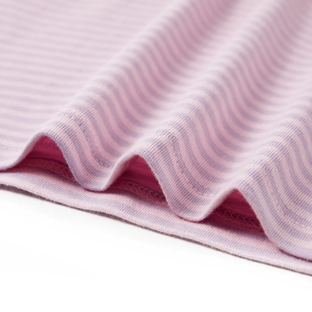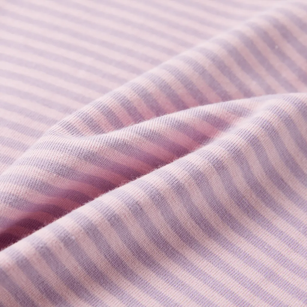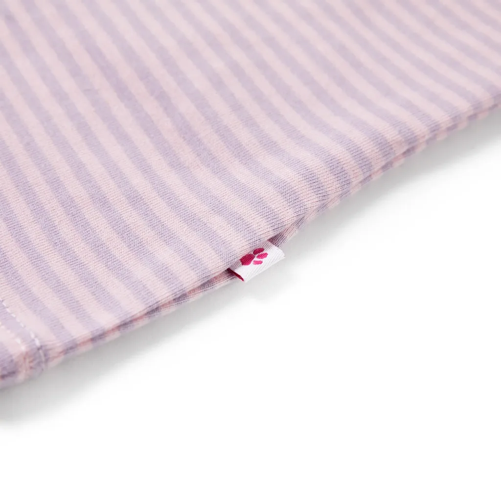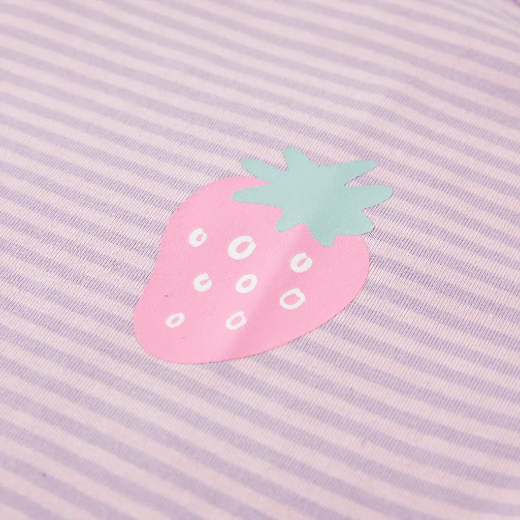 - Triibuline lilla disain maasikatrükiga muudab T-särgi visuaalselt eristuvaks ja lapsele meelepäraseks.