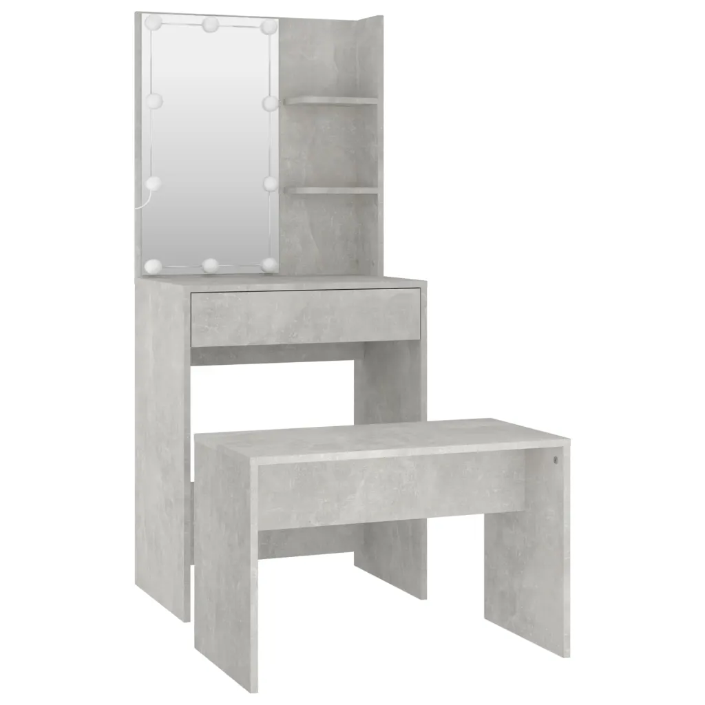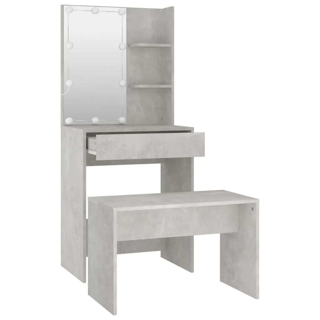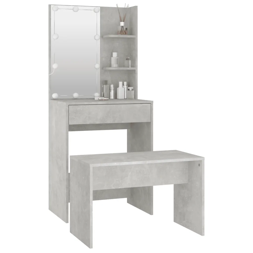 Kui otsite kompaktset ja modernset tualettlauda, mis ühendab endas LED-valgustuse, praktilise peegli ja piisava hoiuruumi, on see betoonhall komplekt usaldusväärne valik. Stabiilsest tehispuidust konstruktsioon, komplekti kuuluv pink ning selge paigaldusjuhend teevad sellest funktsionaalse lahenduse nii magamistuppa kui ka garderoobi.