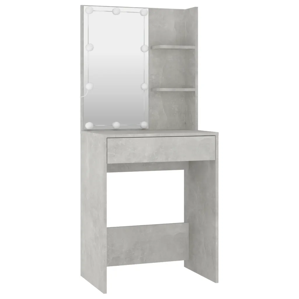 See betoonhalli viimistlusega LED-tualettlaua komplekt pingiga loob magamistuppa eraldi koha igapäevaseks ilurutiiniks. Peegliga tualettlaud aitab mugavalt hoolitseda näonaha ja jumestuse eest, samal ajal kui avatud riiulid ja tööpind hoiavad kosmeetika ning ehted käeulatuses. Kompaktne 60 x 40 x 140 cm suurus sobib hästi ka väiksemasse magamistuppa või garderoobi.