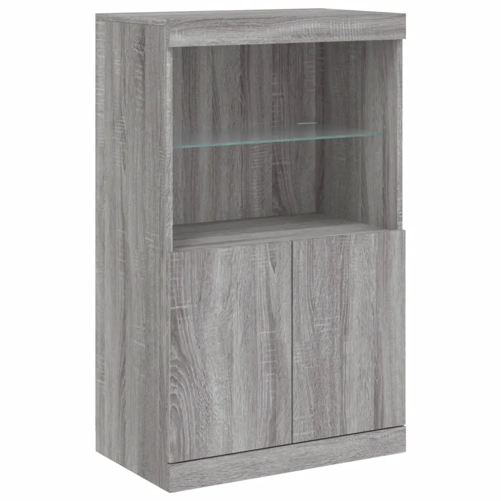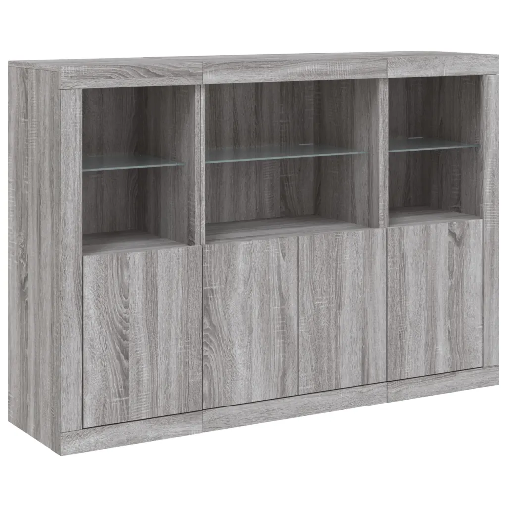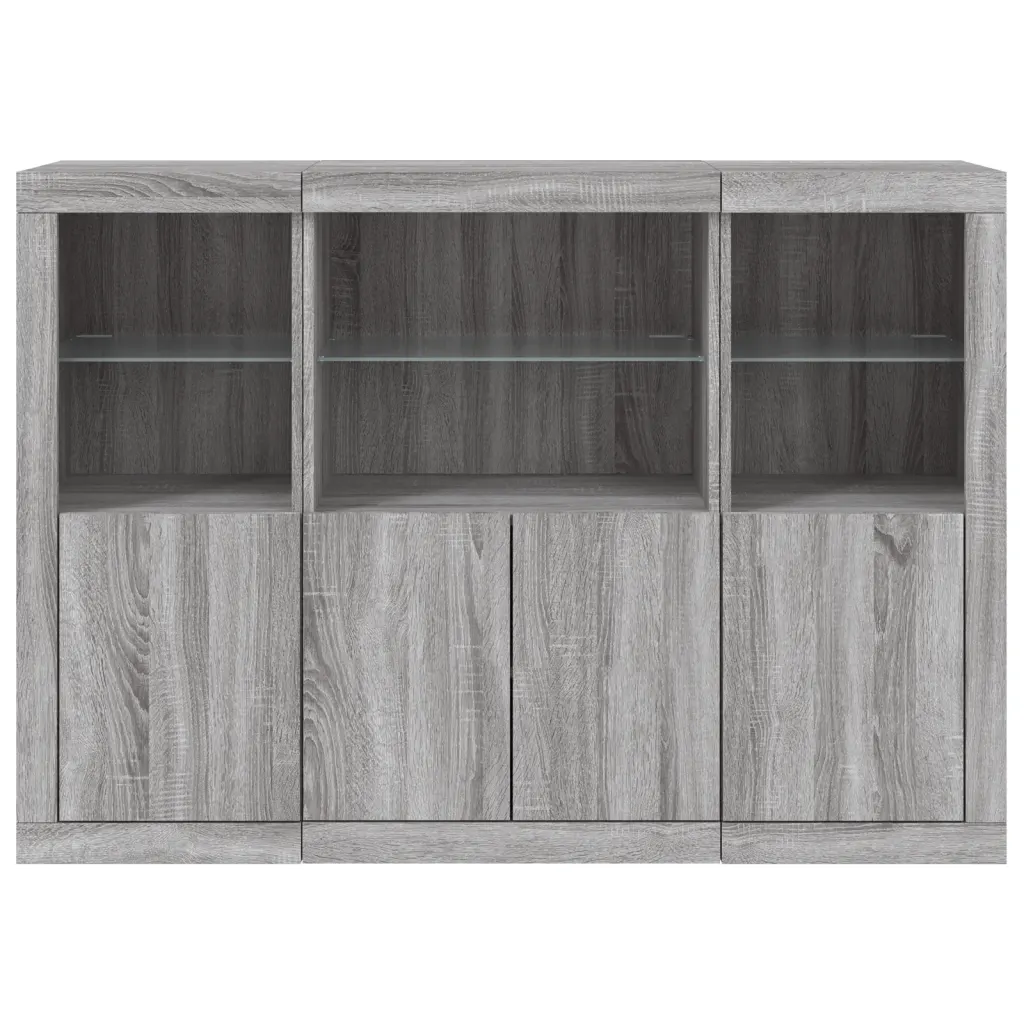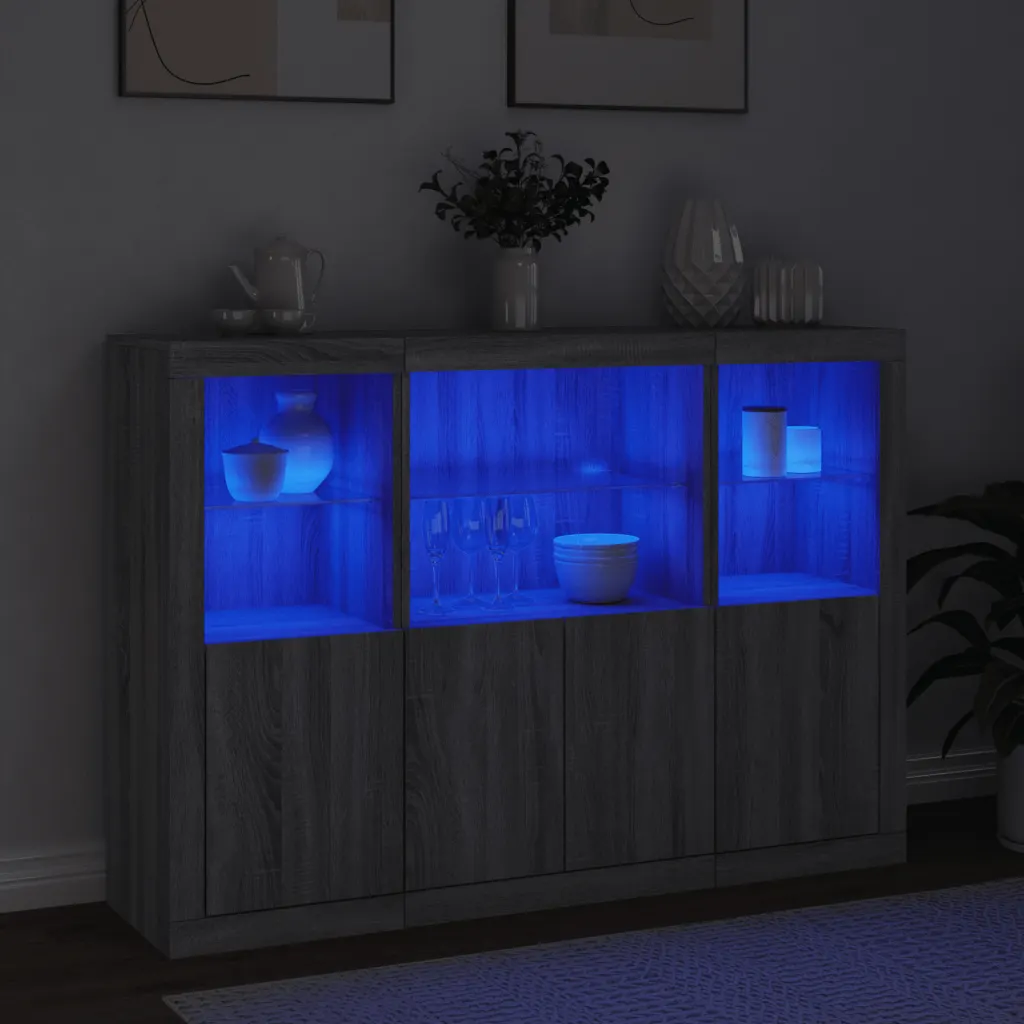 LED-tuledega puhvetkapikomplekt on hea valik, kui soovid ühendada ruumisäästliku hoiustamise ja meeleolu loova valgustuse. Kolmest kapist koosnev lahendus võimaldab mööblit paigutada paindlikult ning hall Sonoma tamme toon ja klaasdetailid sobivad hästi nii modernsesse kui ka klassikalisse interjööri.