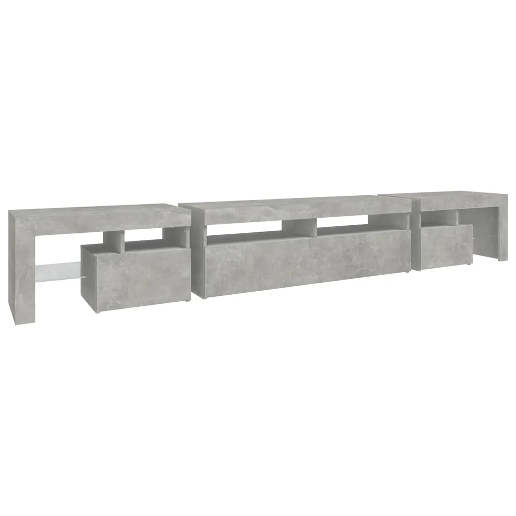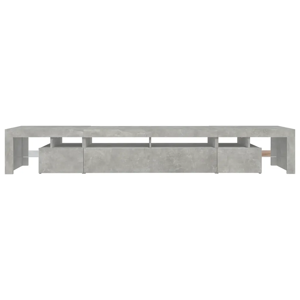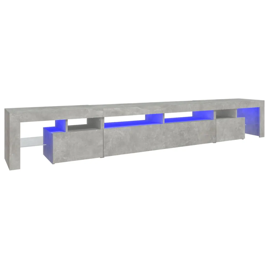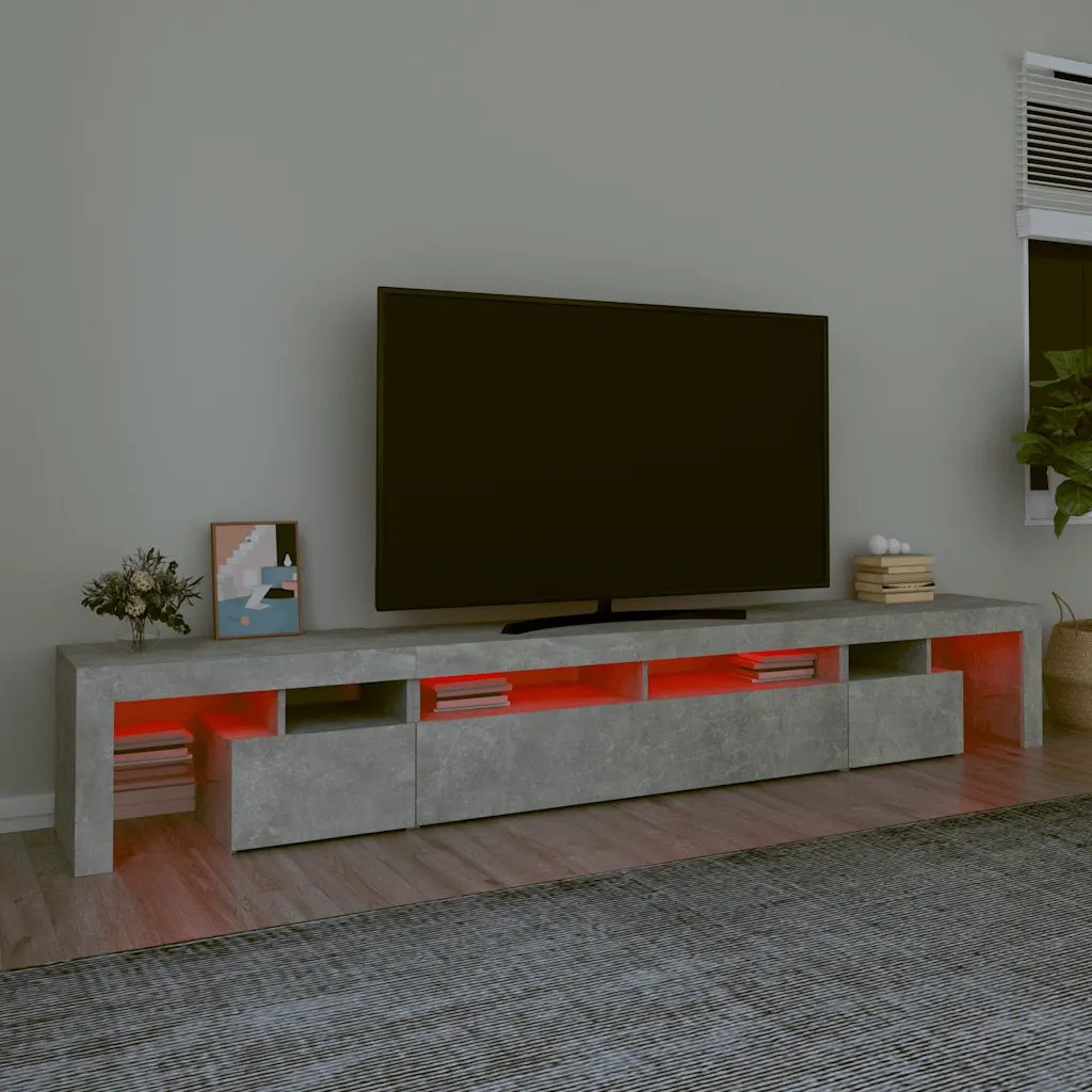 See LED-valgustusega telerialus ühendab modernse välimuse ja praktilise hoiuruumi, et luua elutoas ühtne meedialahendus. Lai 260 cm pikkune telerialus sobib suuremate telerite alla ning pakub avatud riiuleid ja suletud kappe seadmete, meedia ja muude tarvikute korrastatud hoidmiseks. Betoonhall viimistlus ja RGB LED-tuled annavad interjöörile kaasaegse ilme.