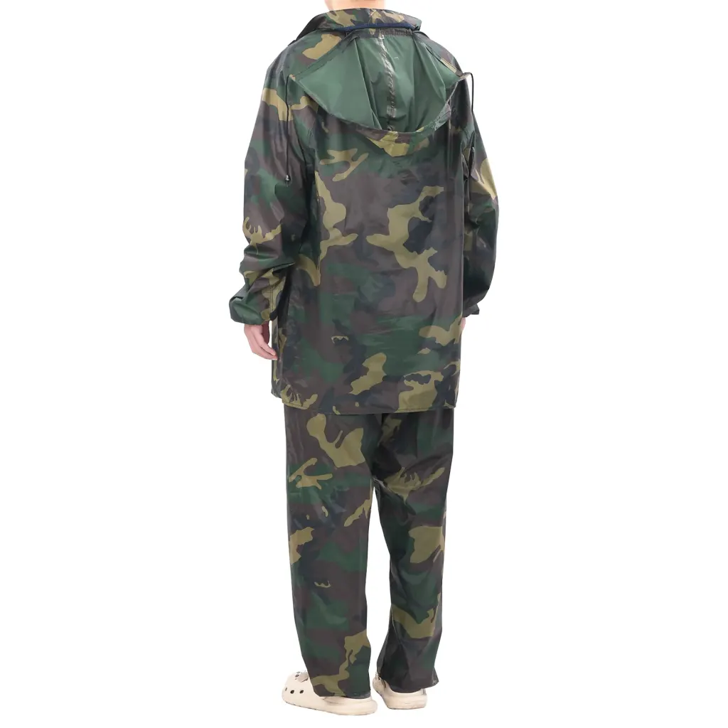 See meeste kaheosaline vihmaülikond on mõeldud kandmiseks matkamisel, jalutuskäigul, kalastusretkel, aiatöödel või ehitusel. Vihmajaki ja -pükste komplekt on valmistatud PVC-kattega polüestrist, mis hoiab sind vihmastes oludes kuivana. Kaitsevärvi muster rohelistes ja mustades toonides aitab ülikonnal sobituda looduskeskkonda.