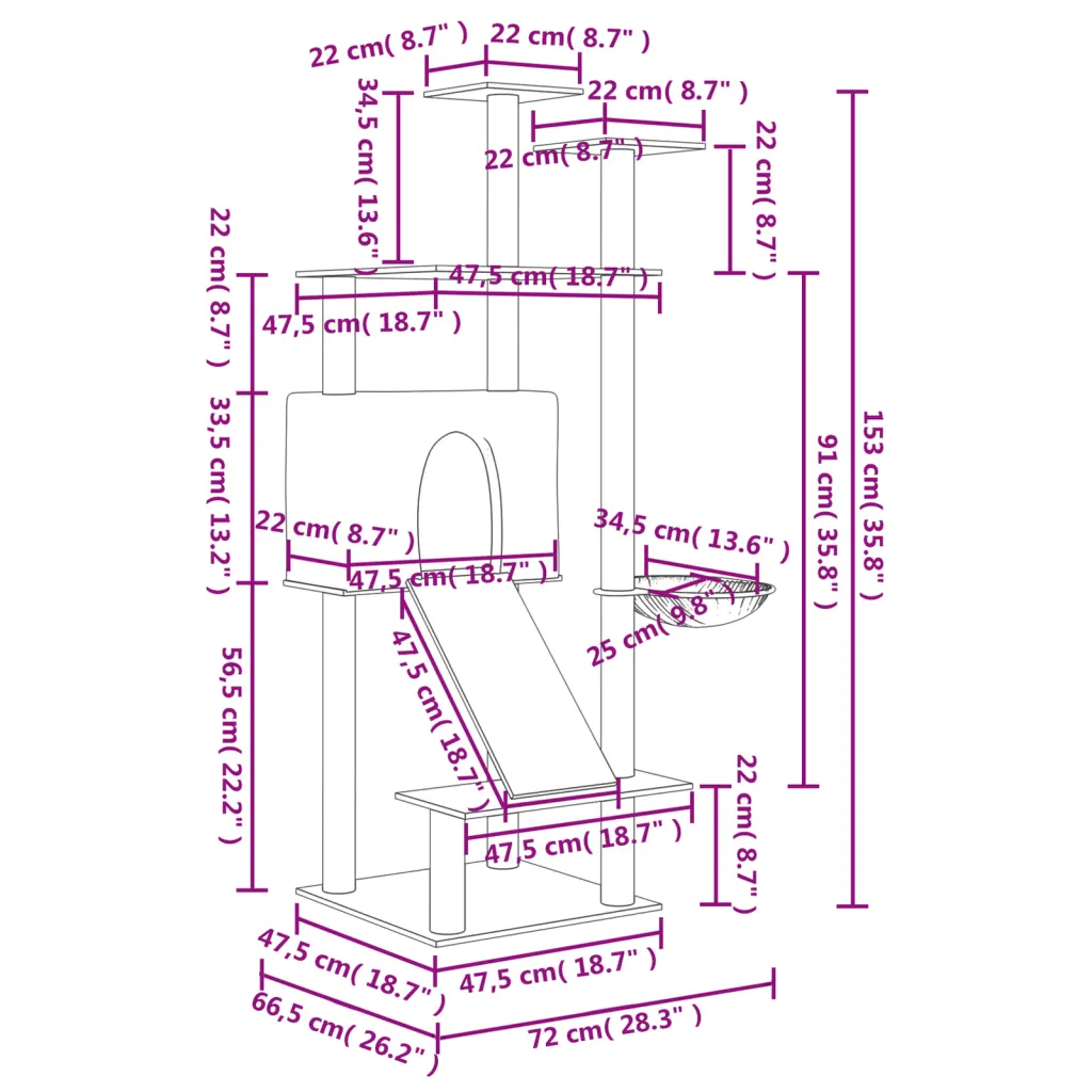 • Puitkonstruktsioon mõõtudega 72 x 66,5 x 153 cm tagab stabiilse aluse ja piisavalt ruumi mängimiseks ja lõõgastumiseks.