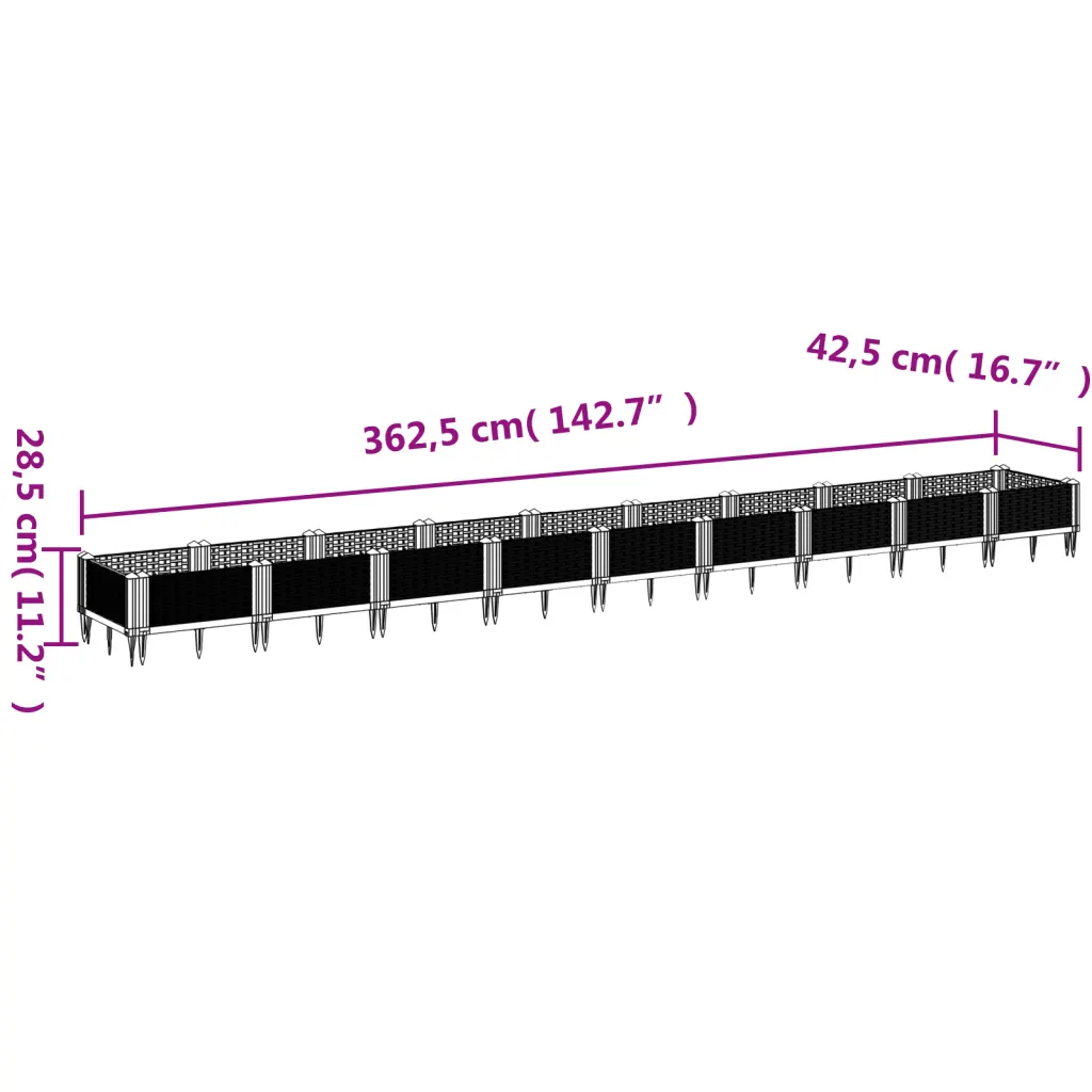 • 11,5 cm kõrgused vaiad surutakse mulda, mis aitab taimekastil paigal püsida ja hoiab serva sirgena.