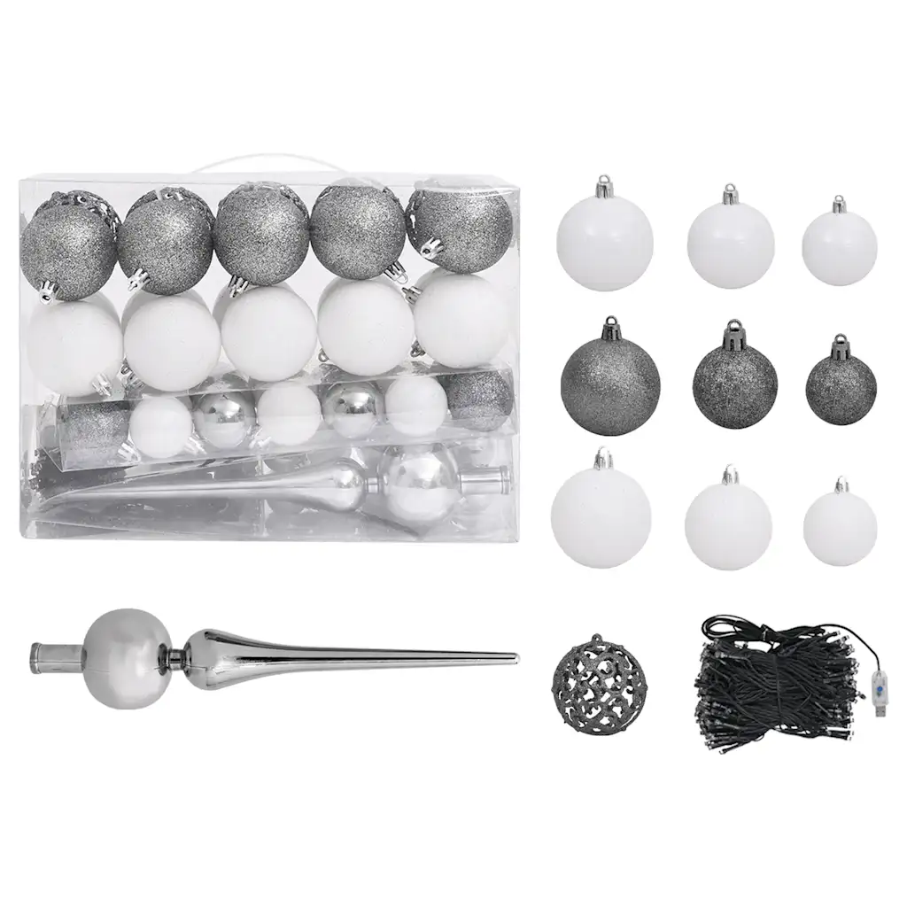 - Läikivad ja sädelevad valged ning hallid kuulid loovad kooskõlalise ja piduliku värvilahenduse.