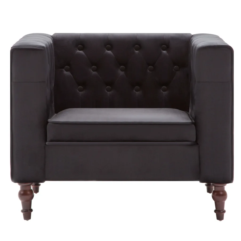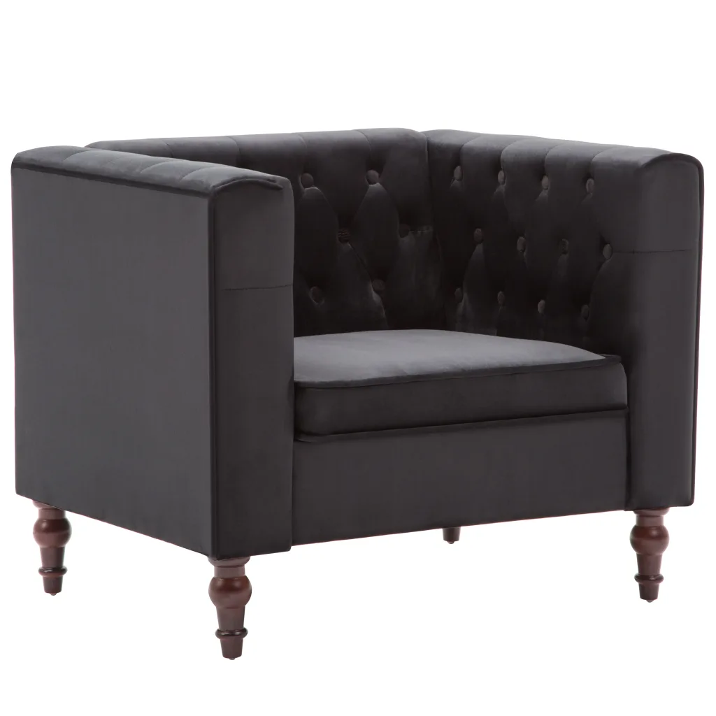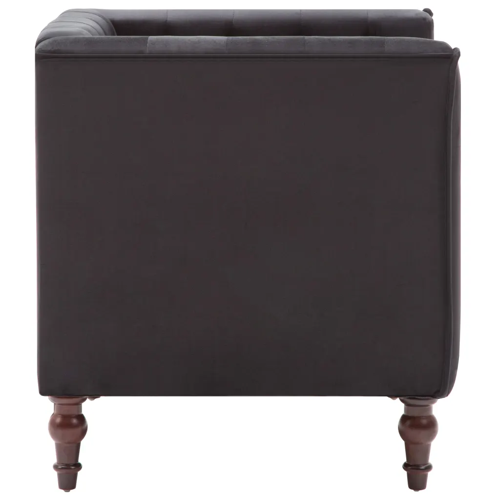 See must sametist tugitool lisab elutuppa, kontorisse või magamistuppa elegantse aktsendi ning loob mugava koha puhkamiseks. Klassikalised nööpdetailid, eriti laia käetugedega kuubikujuline vorm ja kontrastsed puidust jalad annavad interjöörile väljapeetud ilme, samal ajal kui pehme polsterdus tagab mõnusa istumiskogemuse.