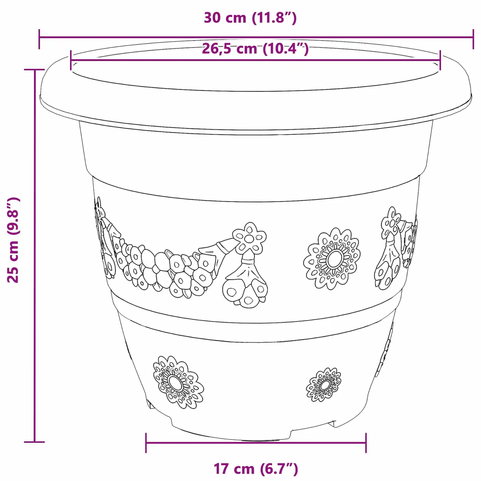 - Praktiline mõõt – läbimõõt on umbes 26 cm ja kõrgus 21,5 cm, mis sobib hästi erinevat tüüpi taimedele alates lilledest kuni väiksemate põõsasteni.