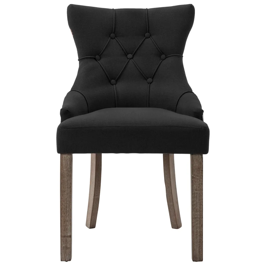 See kaheosaline mustade kangast söögitoolide komplekt sobib suurepäraselt söögituppa või kööki, kus hinnatakse nii mugavust kui ka esinduslikku välimust. Paks polsterdus ja kumer nupplistuga seljatugi loovad toetava istumiskogemuse igapäevasteks toidukordadeks ja pikemateks õhtusöökideks.