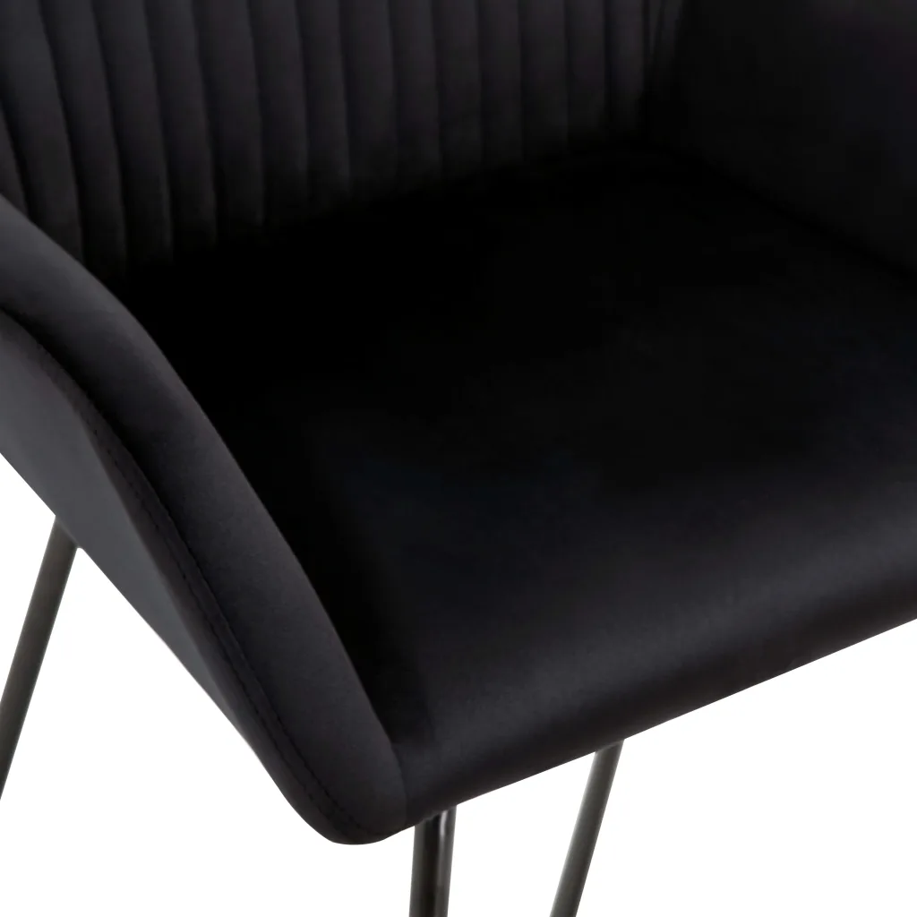 Need mustad sametist söögitoolid loovad söögi- või elutuppa kaasaegse ja hubase ilme. Pehme polster, käetoed ja seljatugi pakuvad mugavat istumisvõimalust nii õhtusöökideks kui lugemiseks ja puhkamiseks. Pulbervärvitud terasjalad annavad toolidele stabiilsuse ja vastupidavuse, sobides igapäevaseks kasutamiseks.