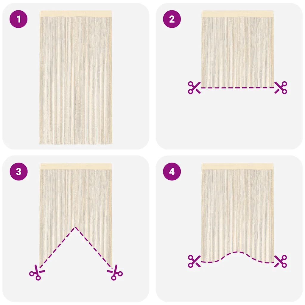 Paigaldamiseks pista kardinapuu läbi kardinate ülaserva tunneli ja aseta kardinapuu valitud ukse- või aknaava kohale. Vajadusel lõika nöörkardinad sobivasse pikkusesse, et need ei jääks põrandale liigselt lohisema. Hoolduseks eemalda kardinad kardinapuu küljest ja pese neid kuni 30 °C juures vastavalt hooldusjuhistele.