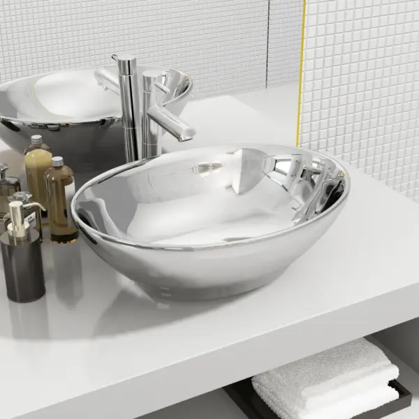 Ovaalne keraamiline kapipealne valamu hõbedase kõrgläikega viimistlusega sobib vannituppa, pesuruumi või tualettruumi, kus on oluline nii välimus kui ka praktilisus. Kompaktne suurus 40 x 33 x 13,5 cm muudab selle heaks valikuks ka väiksematesse ruumidesse.