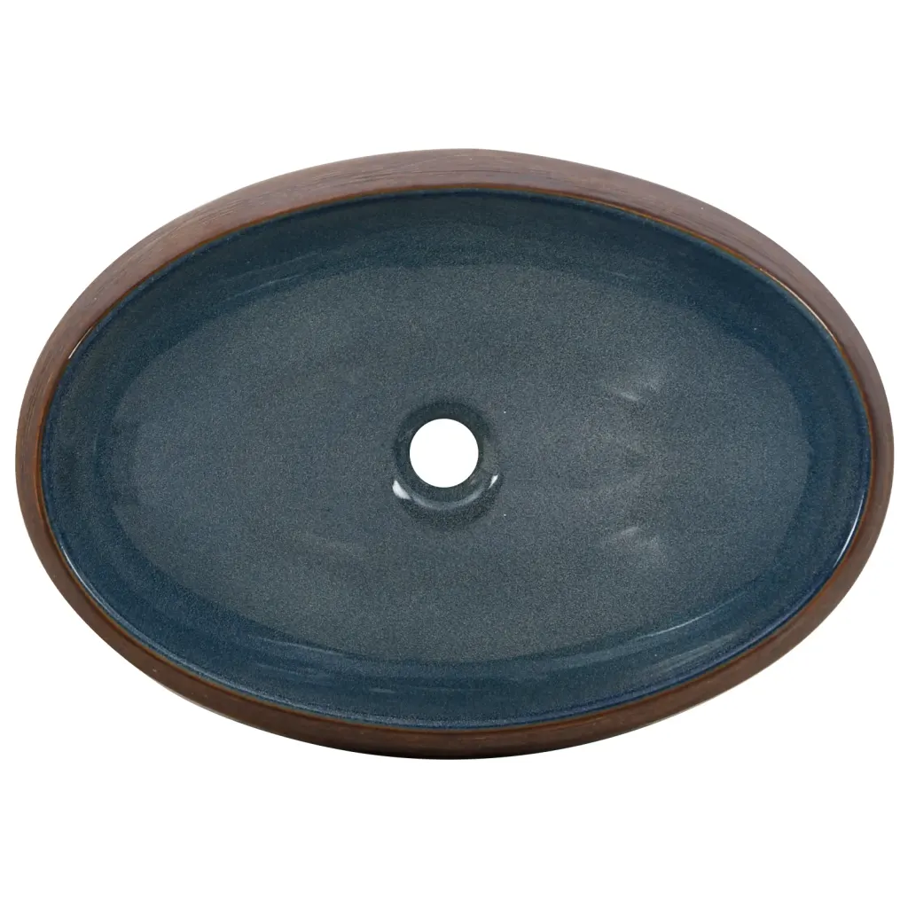 See ovaalne tööpinnapealne keraamiline valamu on elegantne täiendus vannituppa, pesuruumi või tualettruumi, kus soovitakse ühendada isikupärane välimus ja praktiline kasutus. Pruuni ja sinise tooniga pealispind ning käsitsi loodud muster annavad igale valamuile omanäolise ilme, sobitudes nii modernse kui ka klassikalisema sisekujundusega.
