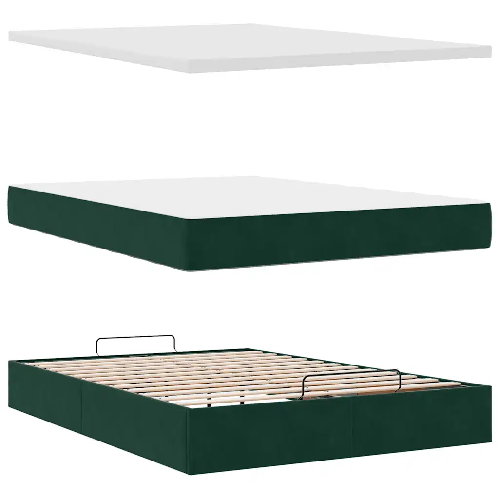 • Peatsiga voodiraam tumerohelise sametkattega, kogumõõtmetega 203 x 144 x 78/88 cm (pikkus x laius x kõrgus), voodialuse panipaiga ja hüdraulilise tõstemehhanismiga.