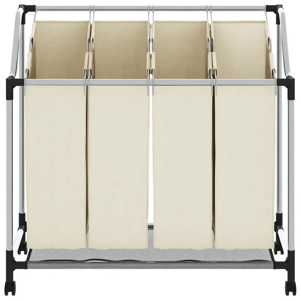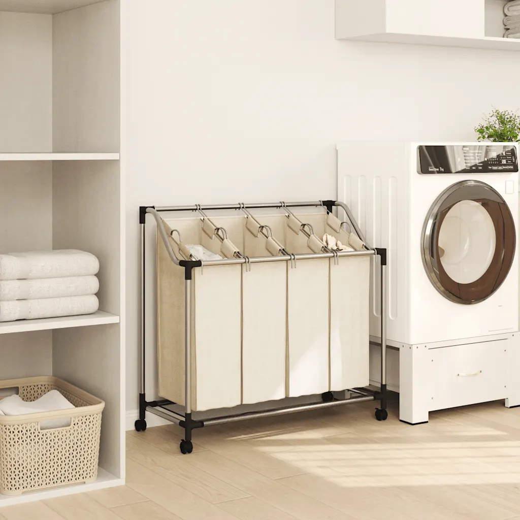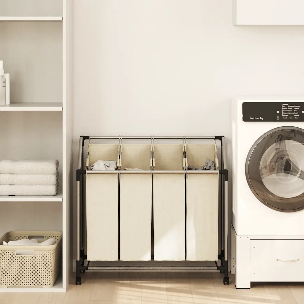 Kreemjasvalge pesusorteerija 4 kotiga aitab hoida musta pesu organiseeritult ja lihtsasti liigutatavaks. See sobib hästi pesuruumi, abiruumi või garderoobi, kus on vaja pesu mugavalt sorteerida, hoiustada ja transportida pesumasinani.