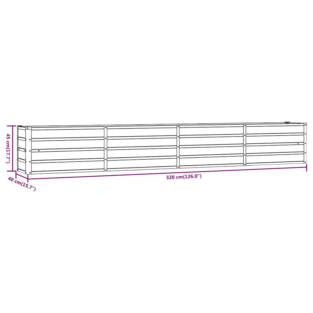 Corteni terasest taimekast on sobiv lahendus, kui soovid luua pika istutusala aeda, rõdule või terrassile. 320 x 40 x 45 cm mõõtmetega kast mahutab rohkelt mulda ning pakub piisavalt ruumi erinevate taimede, juurviljade, ürtide ja lillede kasvatamiseks. Iseloomulik roostes toon lisab väliruumile modernse ja samas looduslähedase ilme.