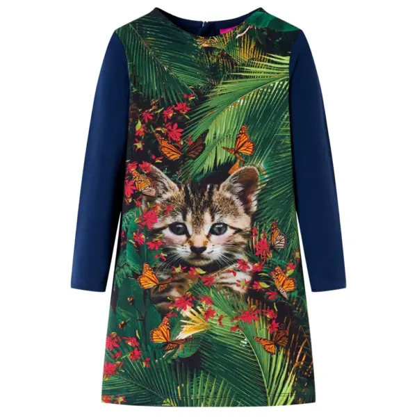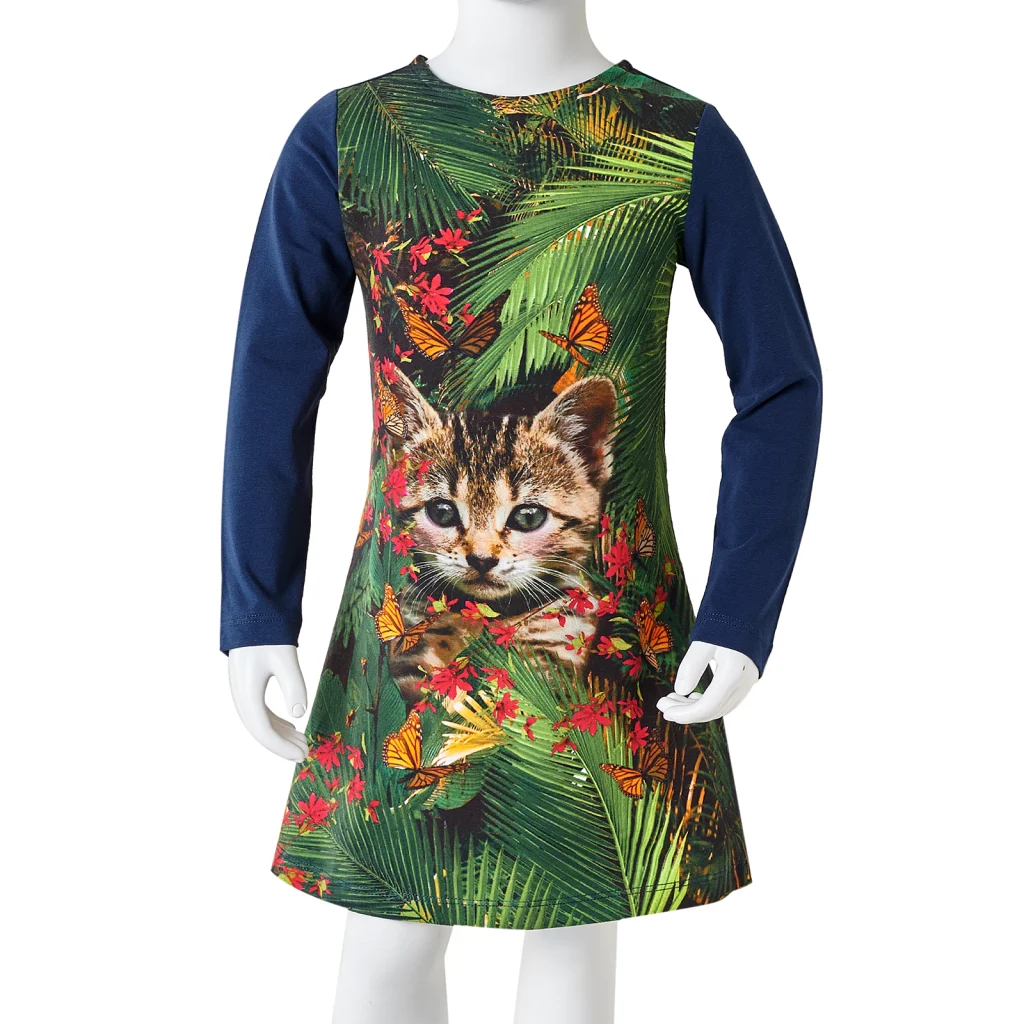 See pikkade varrukatega laste kleit on tumesinises toonis ja esiosal efektse kassipildiga, mis meeldib paljudele loomade sõpradest lastele. Pehmest puuvillasegust valmistatud kleit on hingav ja mõnus vastu nahka, sobides hästi igapäevaseks kandmiseks lasteaias või koolis. Suurus 116 sobib tavaliselt 5–6 aastasele lapsele.