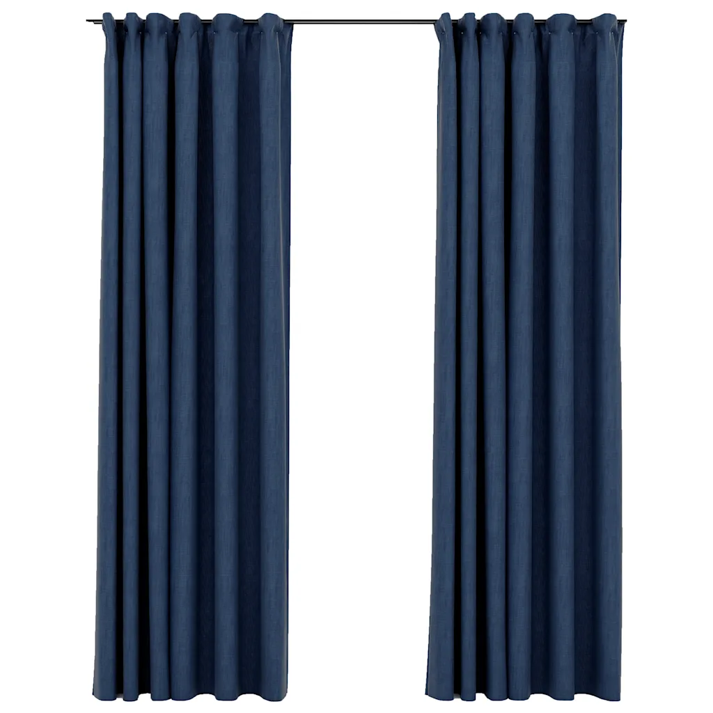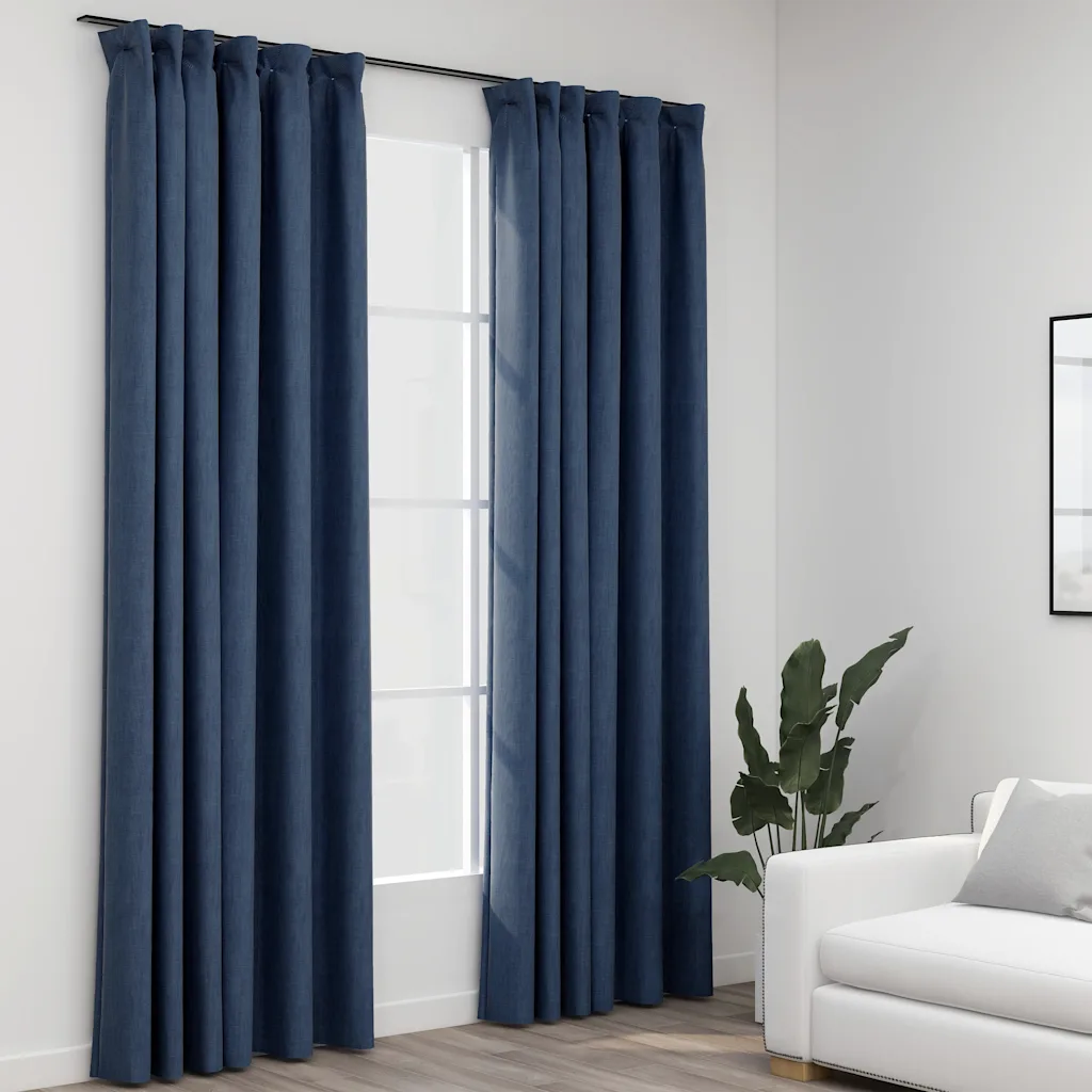 Need pimendavad kardinad aitavad elutoas, magamistoas või teistes tubades vähendada sissetulevat valgust ja luua rohkem privaatsust. Sinine linase välimusega kangas annab interjöörile rahuliku ja ajatu ilme, samas kui metallkonksud võimaldavad kardinaid mugavalt kardinasiinile riputada.
