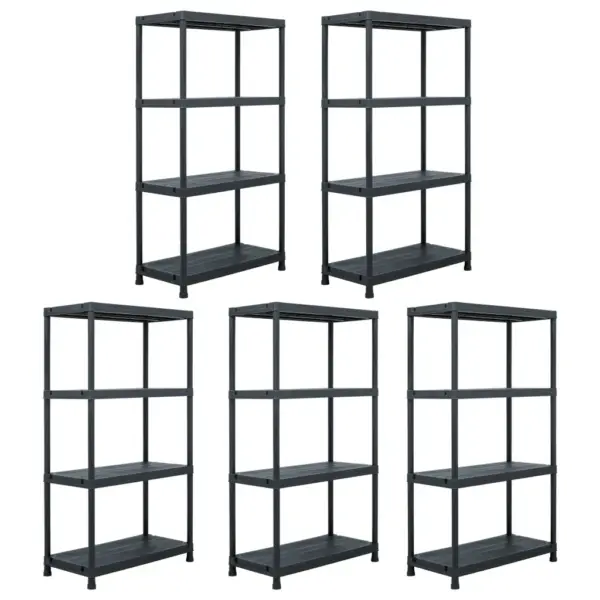 • 5 musta plastist hoiuriiulit igaüks 60 x 30 x 138 cm ja 4 tasapinnaga.