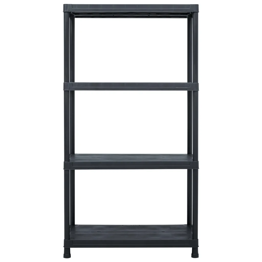 Need mustad plastist hoiuriiulid aitavad korrastada raamatuid, taimi, tarvikuid ja hoiukaste elutoas, köögis, garaažis, laos või keldris. Kompaktsed mõõdud 60 x 30 x 138 cm võimaldavad riiulit kasutada ka kitsastes panipaikades ning vastupidav plast talub hästi niiskust ja on lihtne puhastada. Igal riiulil on 4 tasapinda, mis kannavad kuni 25 kg igaüks ehk kokku kuni 100 kg, pakkudes stabiilset lahendust igapäevaseks hoiustamiseks.