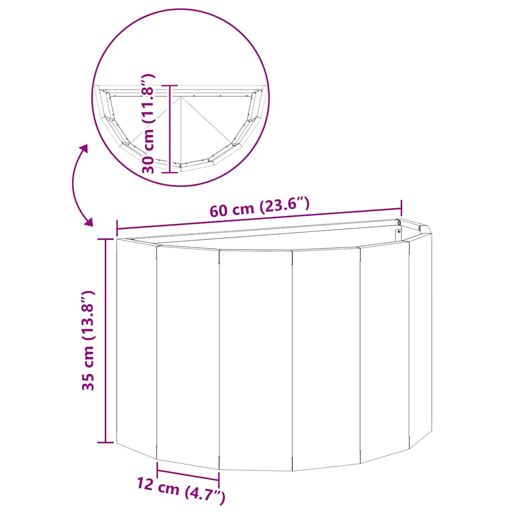 See poolringikujuline taimekast aitab luua aias, terrassil või rõdul puhta ja nüüdisaegse ilme. Hõbedane tsingiterasest konstruktsioon on mõeldud välitingimustes kasutamiseks, pakkudes taimedele stabiilset ja vastupidavat kasvukohta. Kompaktsete mõõtmetega 60 x 30 x 35 cm kast sobitub hästi seinte ja piirete äärde, kasutades nutikalt ära piiratud ruumi.