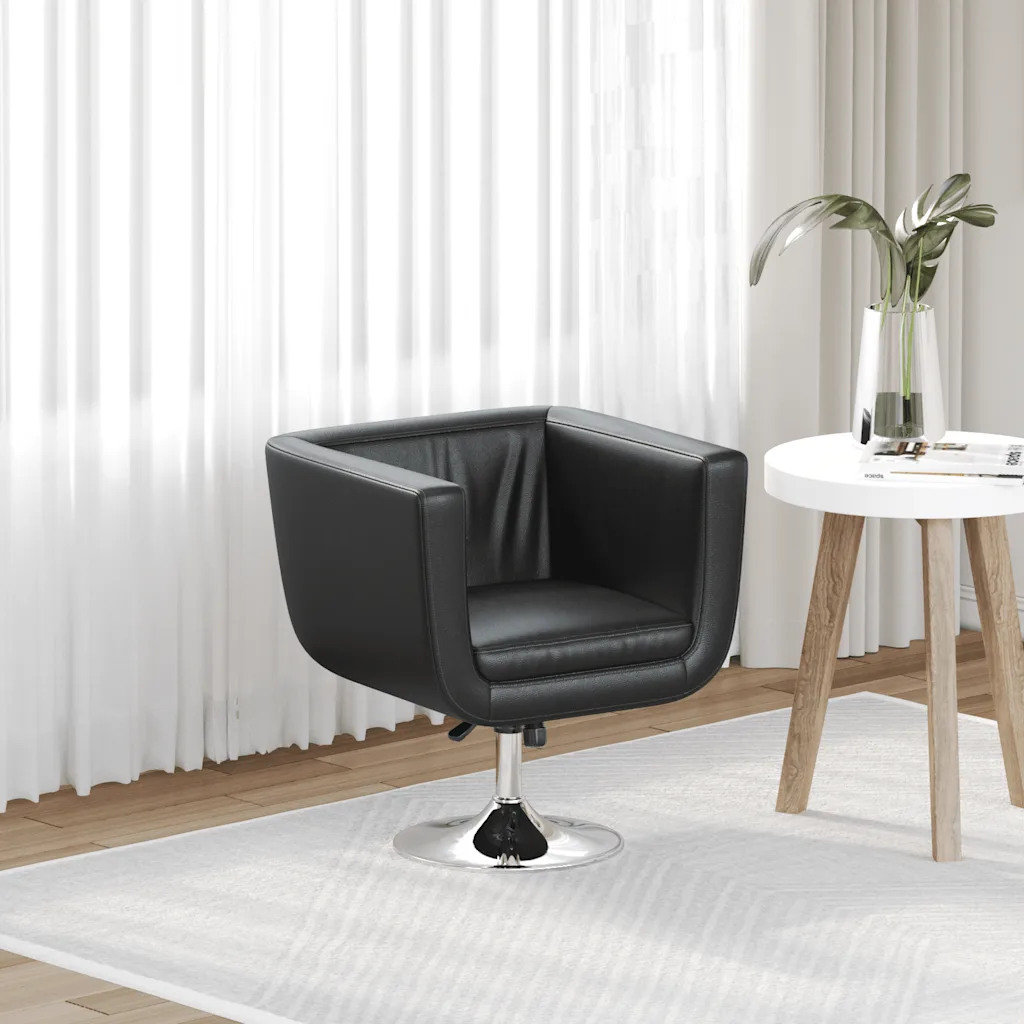 Must pöördeline kunstnahast tugitool ühendab kompaktse suuruse 63 x 59 x 66,5–75,5 cm ja reguleeritava istmekõrguse 40,5–50,5 cm, sobides elutuppa, ühiselamusse, puhkeruumi või kontorisse. Keskmise kõrgusega seljatugi ja pehme polsterdus toetavad mugavat istumist, samal ajal kui kroomitud terasest alus tagab stabiilsuse.