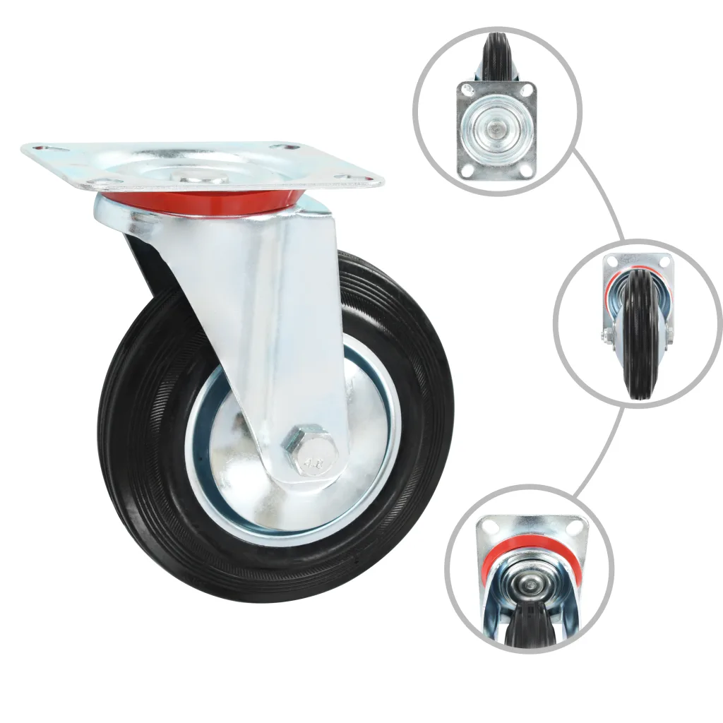 Need mustad pöörlevad kummirattad sobivad väikestele seadmetele ja mööblile, nagu tööpingid, kärud, kohvilauad, taimealused, raamaturiiulid ja ostukärud. 160 mm läbimõõduga rattad liiguvad tänu heale löögi- ja vibratsioonikindlusele sujuvalt ning kummipind aitab kaitsta põrandaid kriimustuste eest. Tsingiga kaetud rauast raam lisab ratastele tugevust ja roostekindlust, mistõttu sobivad need igapäevaseks kasutamiseks. Iga ratta maksimaalne kandevõime on 150 kg ning komplektis on kokku 16 ratast.