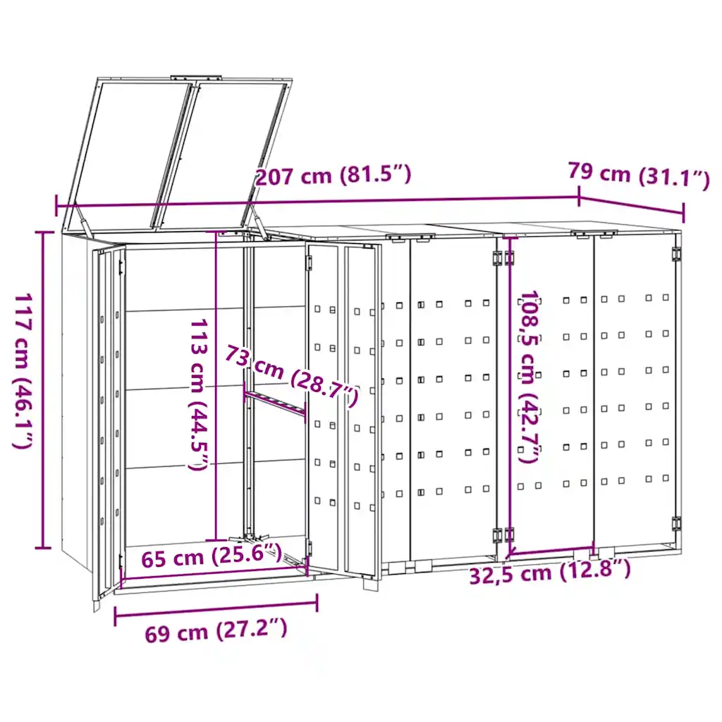 • Kompaktsed mõõtmed 207 x 79 x 117 cm (laius x sügavus x kõrgus) ja sisemõõt iga prügikasti jaoks 65 x 73 x 113 cm võimaldavad kuuri paigutada ka kitsamale majaesisele või aianurgale.