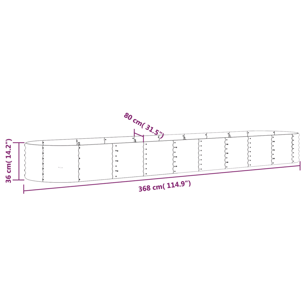 See pruun aia taimelava mõõtmetega 368 x 80 x 36 cm pakub palju ruumi lillede, köögiviljade ja ürtide kasvatamiseks. Vastupidavast galvaniseeritud terasest valmistatud ovaalne taimekast sobib hästi aeda, terrassile või murule ning aitab istutusalad selgelt piiritleda.
