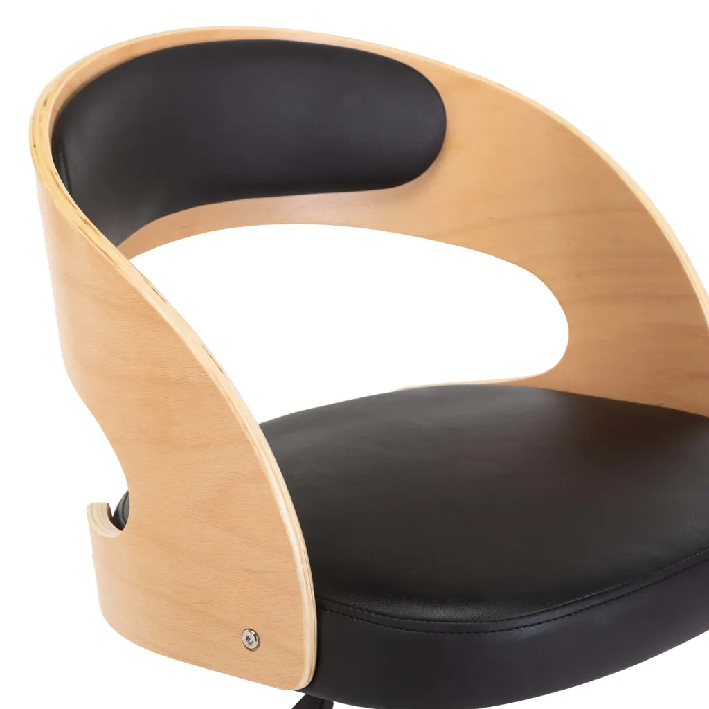 See ratastega söögitool ühendab kompaktse kuju, mugava polstri ja lihtsa liigutatavuse, sobides hästi nii söögituppa kui kodukontorisse. Mustast hõlpsasti puhastatavast kunstnahast iste ja painutatud vineerist seljatugi moodustavad modernse koosluse, mis pakub mugavat toetust igapäevasel istumisel.