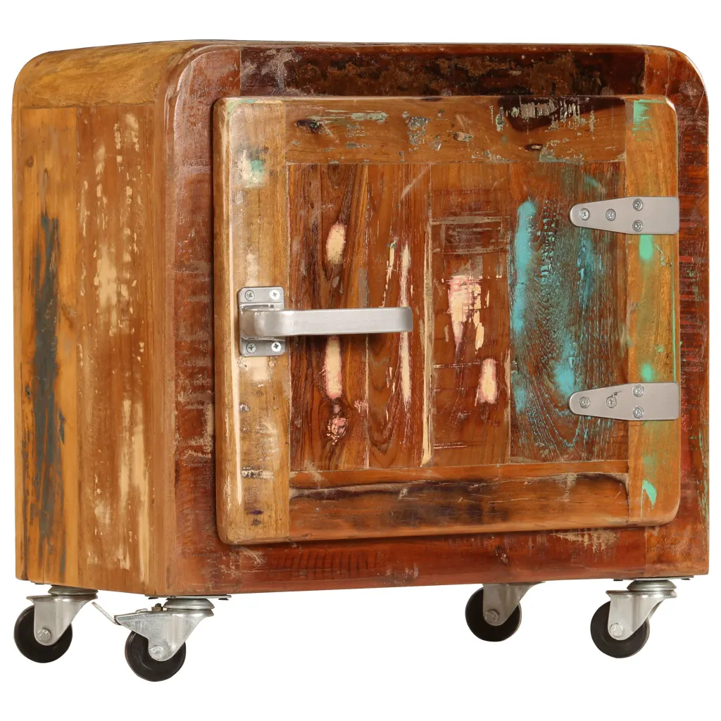 See ratastel taaskasutatud puidust öökapp pakub kompaktset panipaika ja lisab interjöörile iseloomukat, kergelt tööstuslikku ilmet. Mitmevärviline viimistlus ja nähtavad puidukiud muudavad iga mööblieseme unikaalseks, sobides nii magamistuppa öökapiks kui ka väikeseks lisakapiks mujal kodus.