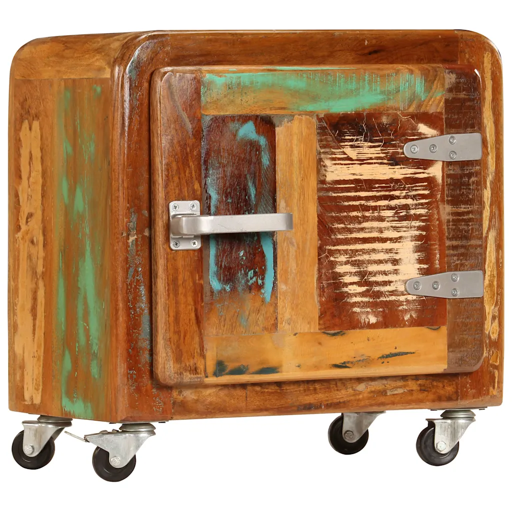 Kui otsid mööblieset, mis ühendab praktilise panipaiga ja eristuva välimuse, on see taaskasutatud puidust öökapp ratastega sobiv valik. Kompaktne mõõt, üks uksega kapp ja neli ratast teevad selle lihtsasti paigutatavaks ning ümbertõstetavaks, samal ajal kui iga eksemplari kordumatu värvi- ja mustrimäng lisab ruumile omanäolist ilmet.