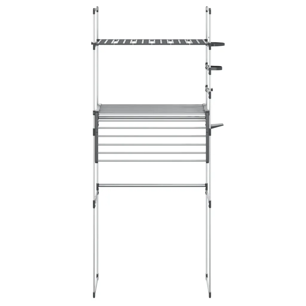 Kui vannitoas napib hoiuruumi, aitab pesumasina kohale paigaldatav riiul kasutada ära seni tühja pinna seadme või WC kohal. Kerge, kuid tugev alumiiniumraam loob lisakorruse pesuvahendite ja tarvikute jaoks, samas kui sisseehitatud kuivatusrest pakub mugavat kohta pesu kuivatamiseks.