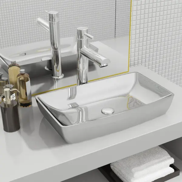 Ristkülikukujuline hõbedane keraamiline kapipealne valamu on šikk ja ajatu valik vannituppa, pesuruumi või tualettruumi. Kõrgläikega pind lisab ruumile elegantsi ning sile keraamika on igapäevases kasutuses lihtsasti puhastatav.