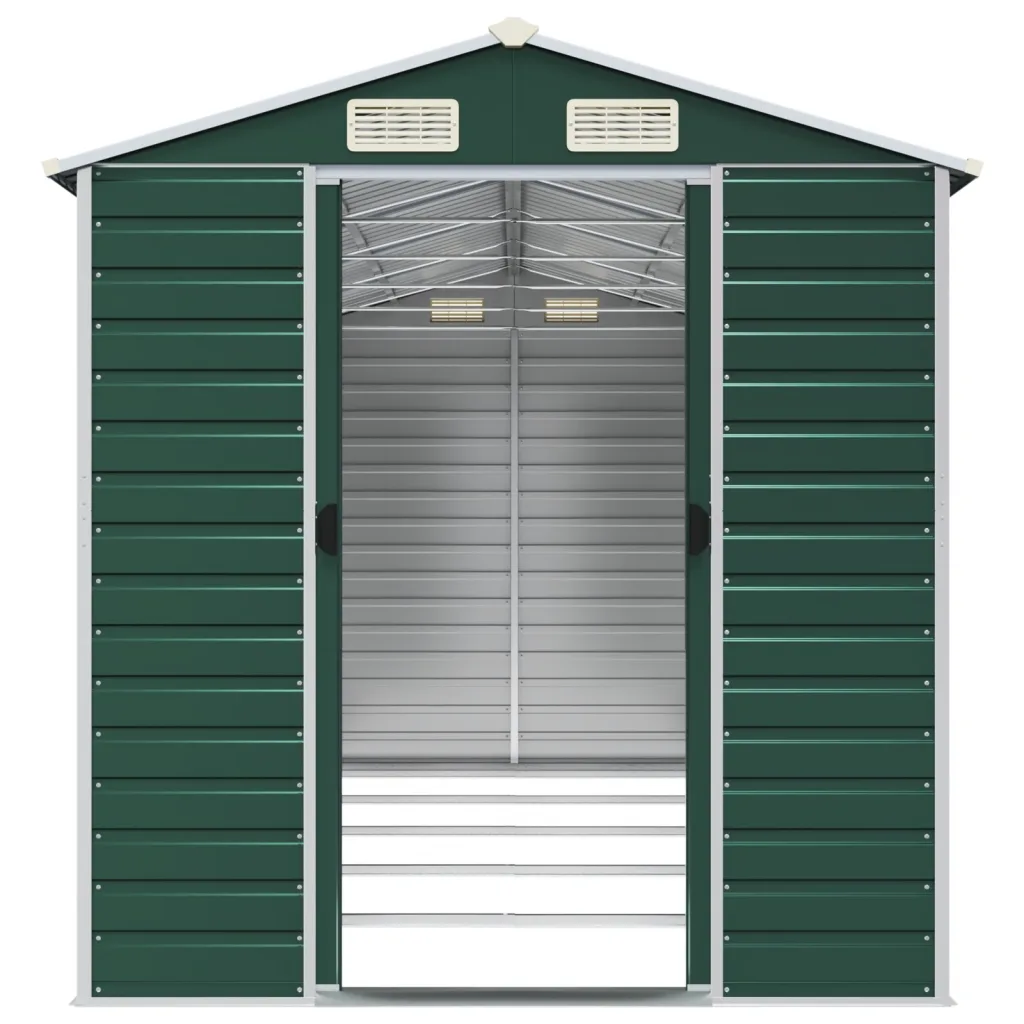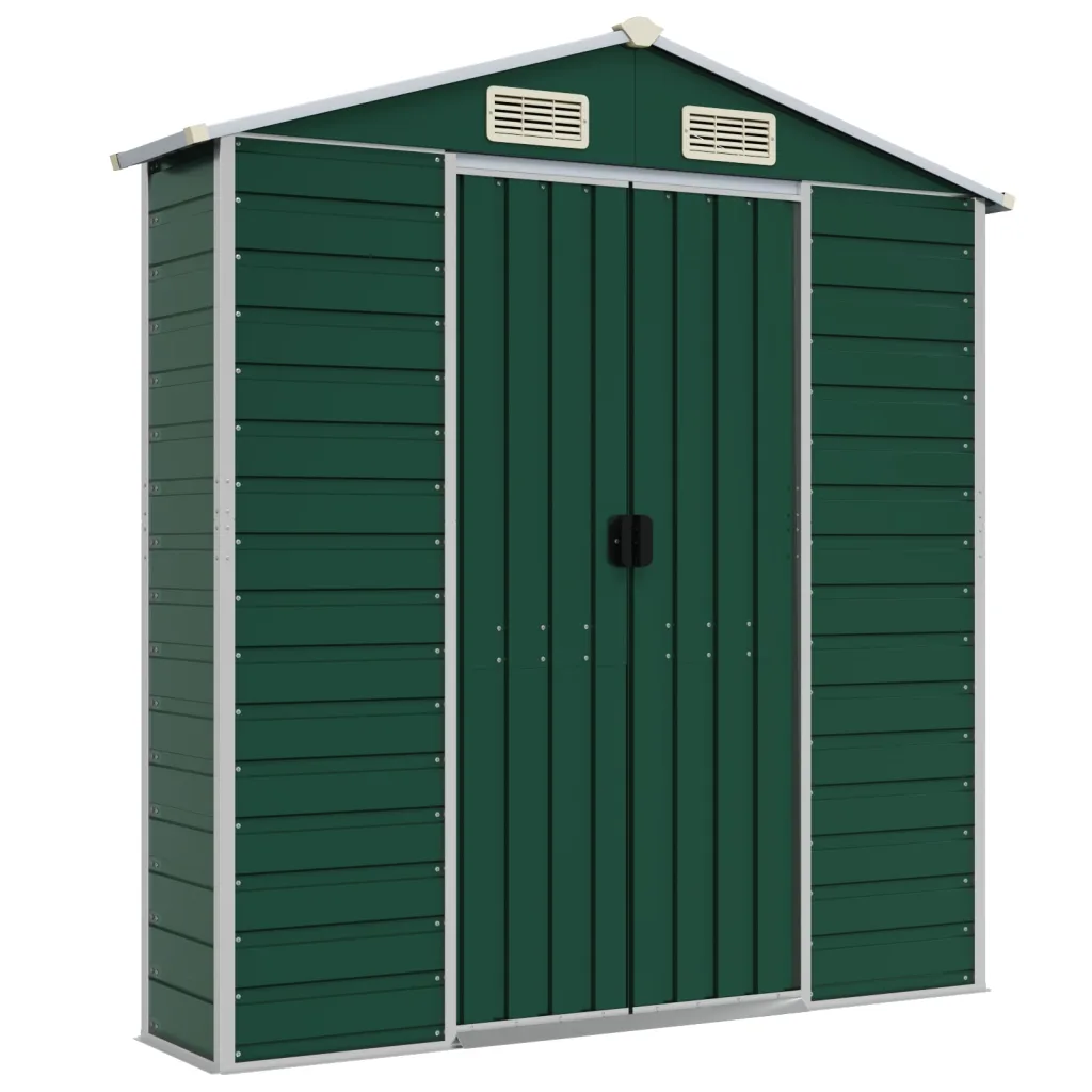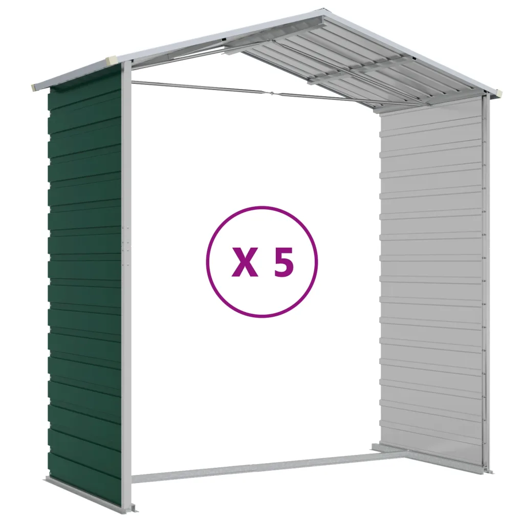 See roheline aiakuur tsingitud terasest aitab hoida küttepuud, aiatööriistad, mööbli ja seadmed ühes kohas ning kaitstuna. Metallkonstruktsioon koos kaldkatuse ja ventilatsiooniavadega vähendab niiskuse kogunemist ja kaitseb sisu sademete eest, pakkudes praktilist lahendust õuehoiustamiseks.