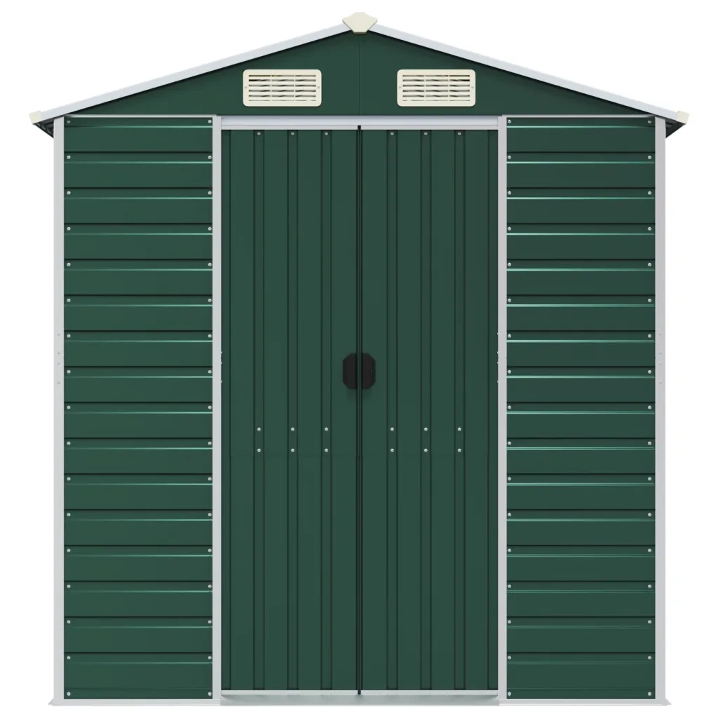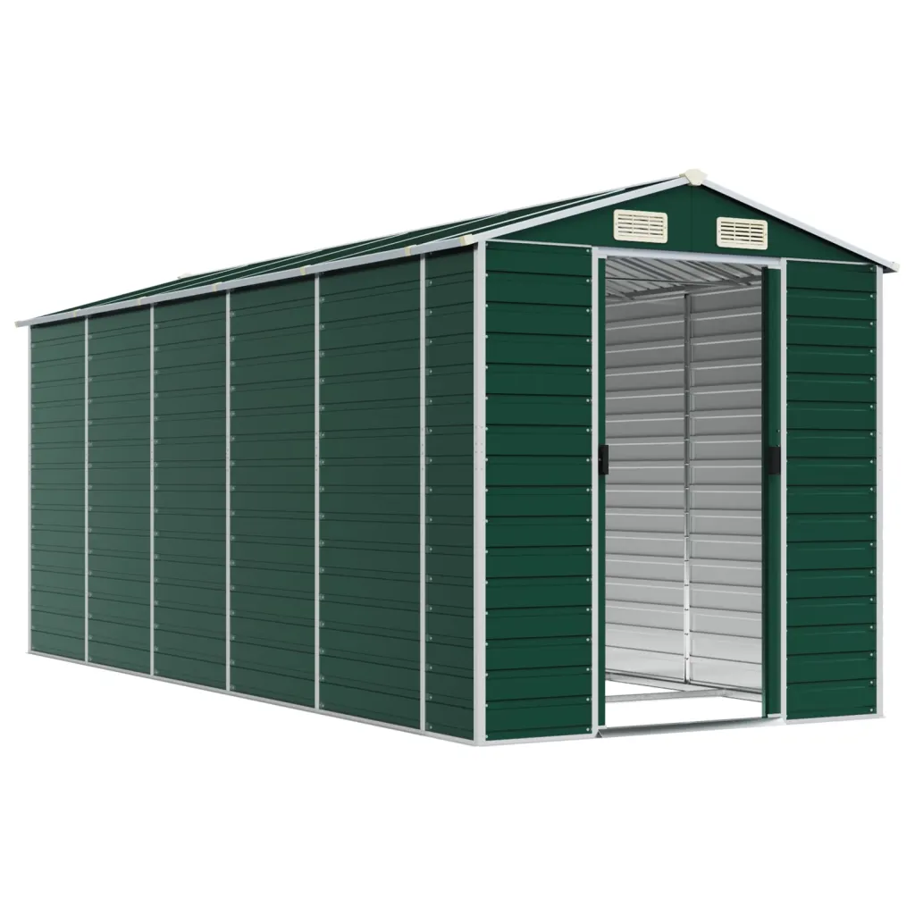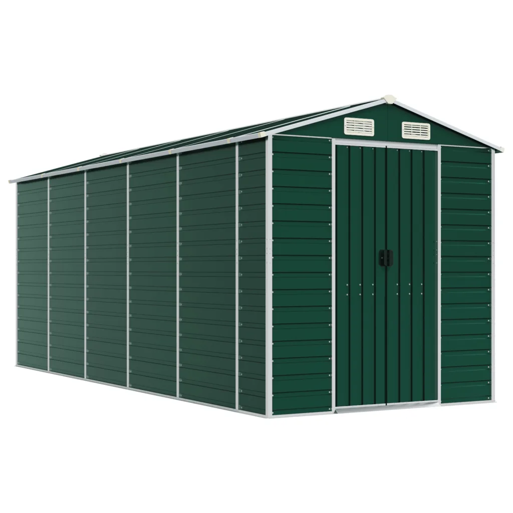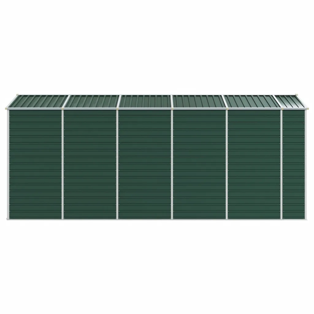 See roheline aiakuur tsingitud terasest aitab hoida küttepuud, aiatööriistad, mööbli ja seadmed ühes kohas ning kaitstuna. Metallkonstruktsioon koos kaldkatuse ja ventilatsiooniavadega vähendab niiskuse kogunemist ja kaitseb sisu sademete eest, pakkudes praktilist lahendust õuehoiustamiseks.