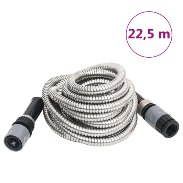 See hõbedane roostevabast terasest aiavoolik pikkusega 22,5 m sobib igapäevaseks kastmiseks ja puhastustöödeks ümber maja. 8-funktsiooniline pihustusotsak võimaldab valida sobiva veejuga nii õrnaks taimede kastmiseks kui ka tõhusaks pesemiseks.