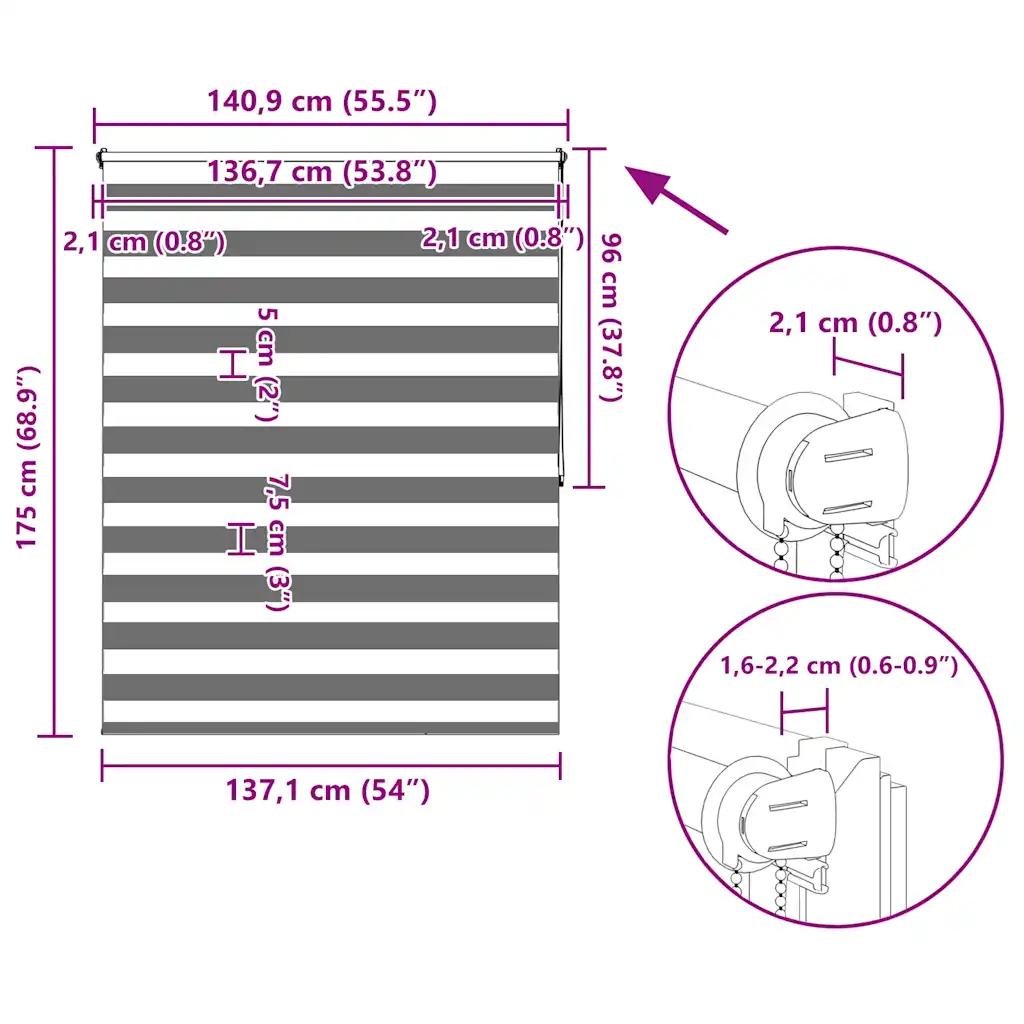 Ruloo ülemise siini nimilaius on 140 cm ning koos kinnitustarvikutega on siin ligikaudu 3 cm laiem kui kangas. Tänu kompaktsele metalltorule ja komplektis olevatele kronsteinidele saab ruloole leida sobiva koha enamiku akende ees. Tõmbeketiga saab reguleerida, kas läbipaistmatud ja läbipaistvad triibud kattuvad või nihkuvad üksteise suhtes, mis võimaldab kiirelt vahetada avatud, poolavatud või privaatsust pakkuva asendi vahel.