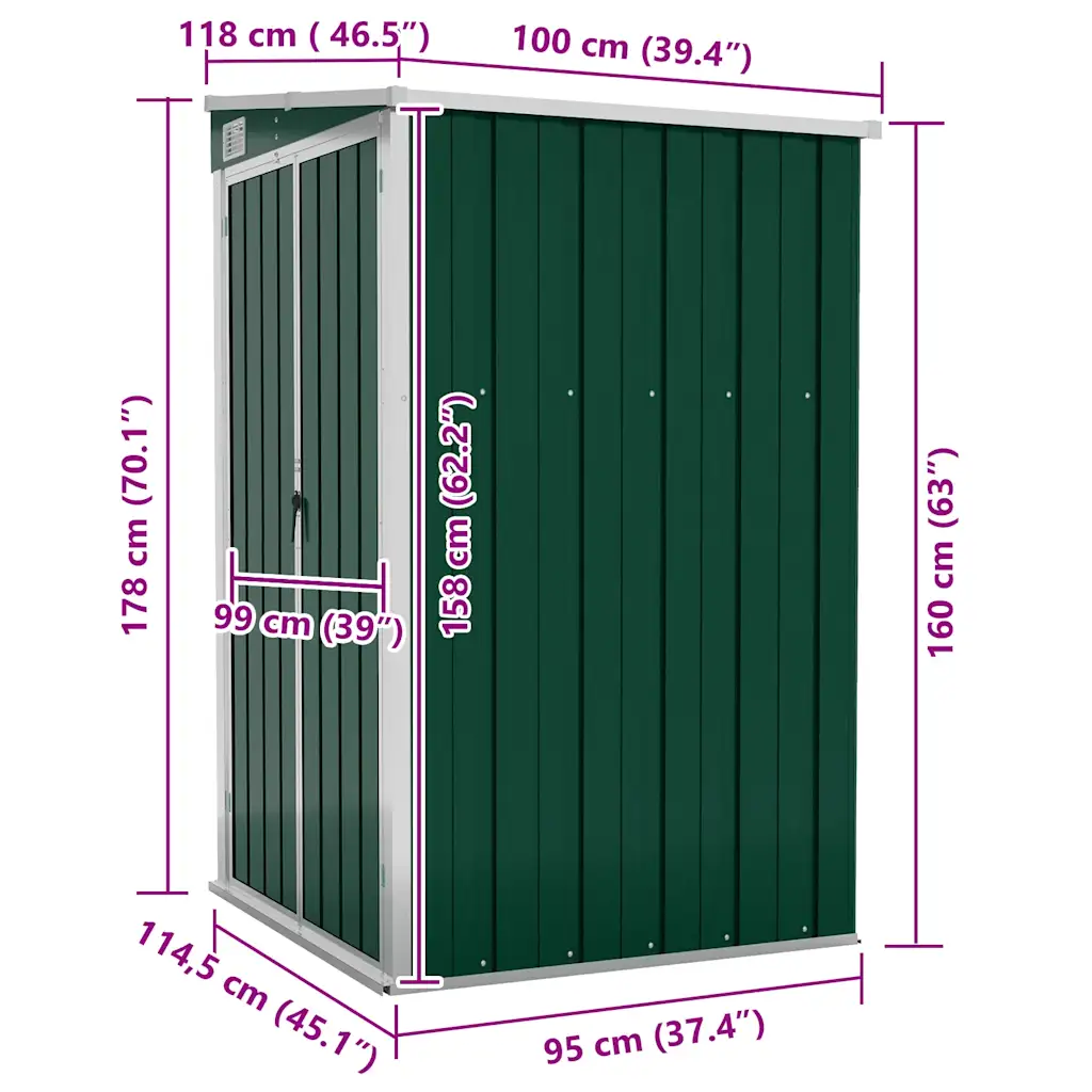 • Kompaktne mõõt 118 x 100 x 160/178 cm (L x S x K) pakub piisavalt ruumi tööriistadele ja aiatarvikutele, võtmata liigselt ruumi hoovist.