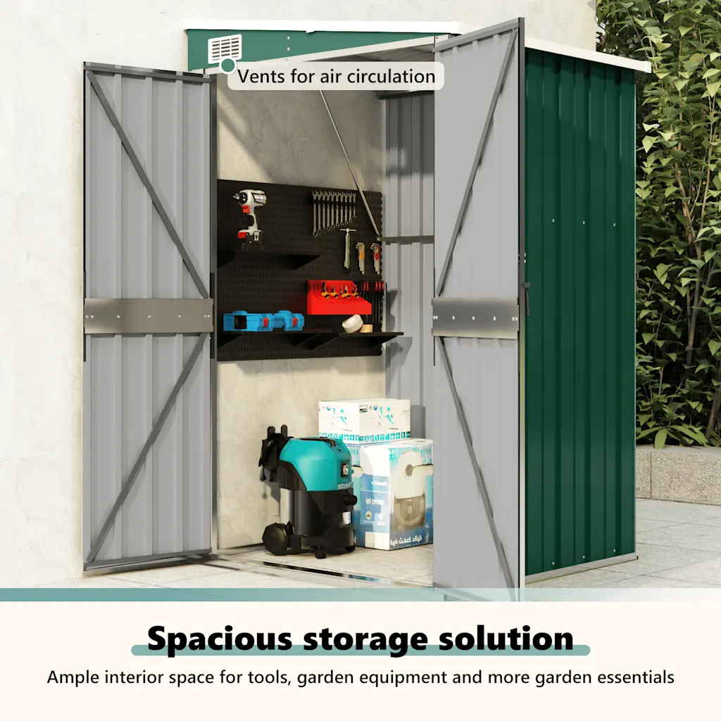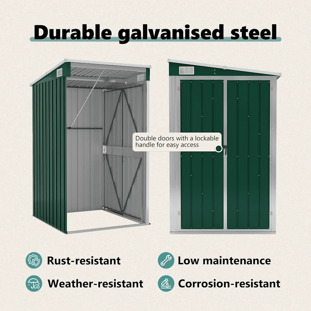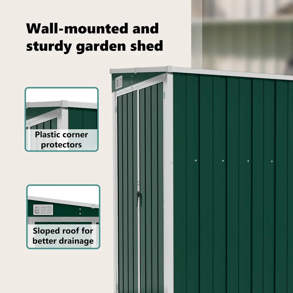 See roheline seinale kinnitatav aiakuur sobib hästi neile, kes otsivad vastupidavat ja ruumisäästlikku lahendust tööriistade ja aiatarvikute hoiustamiseks. Tugev tsingitud terasest konstruktsioon, lukustatav uksesüsteem ja läbimõeldud mõõdud teevad sellest praktilise valiku nii koduaeda, terrassile kui ka väiksemale hoovile.