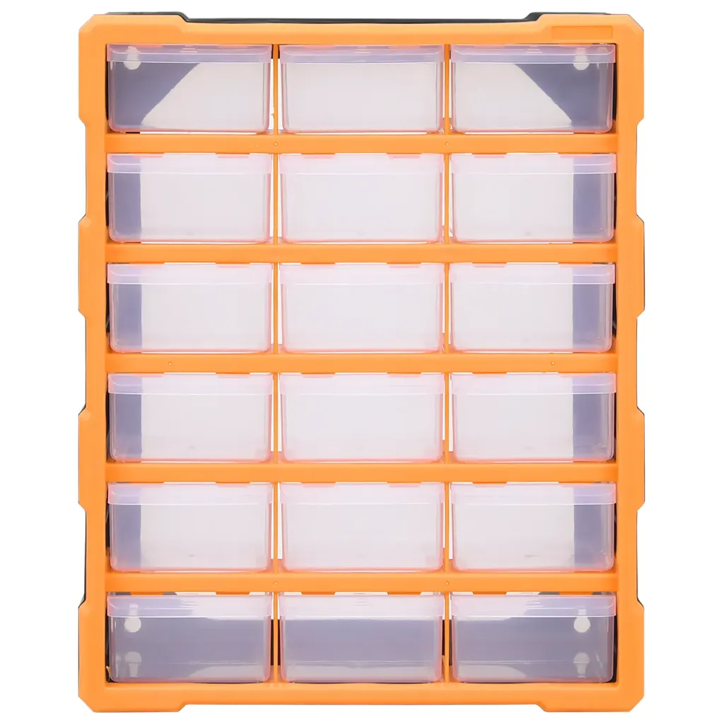 18 keskmise sahtliga tööriistade organiseerija aitab korrastada mutreid, polte, kruvisid ja muid väikeseid detaile töökohas või koduses töötoas. Vastupidavast PP-plastist korpus oranži ja musta värviga ning läbipaistvad sahtlid võimaldavad sisu kiiresti üles leida ja hoiavad tööpinna korras.