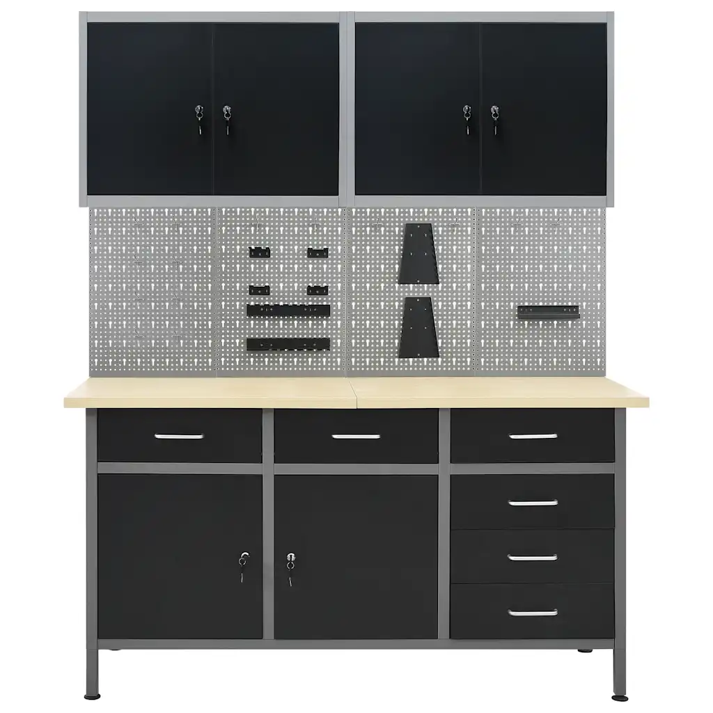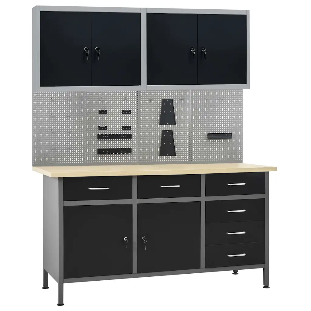 See komplekt koosneb ühest tugevast terasest tööpingist, neljast perforatsiooniga seinapaneelist ja kahest seinakapist, luues ühtse hoiulahenduse garaaži või töökotta. 500 kg kandevõimega töölaud ja kuus sahtlit aitavad hoida tööriistad, väikesed detailid ja tarvikud alati käeulatuses. Musta ja halli tooniga metallkonstruktsioon ning paks puidutaolise viimistlusega lauaplaat on vastupidavad ja kergesti puhastatavad.