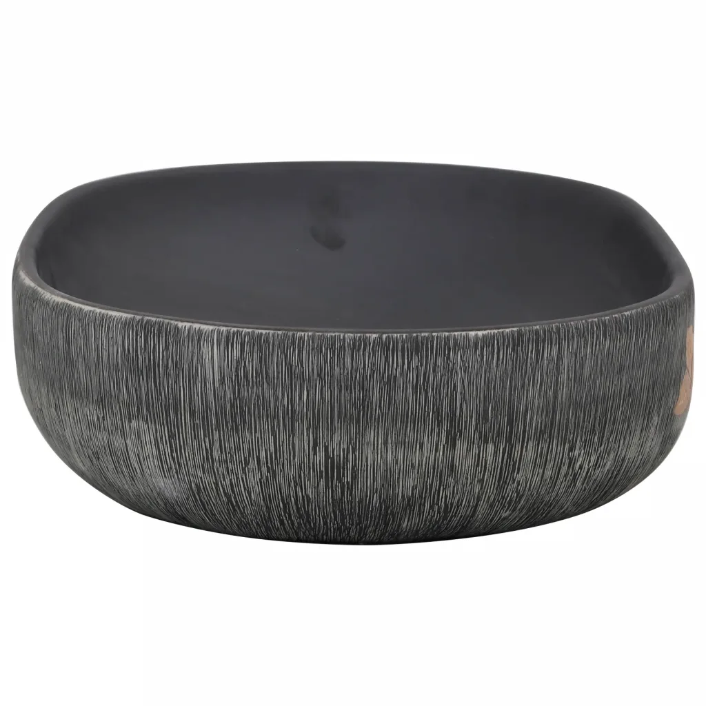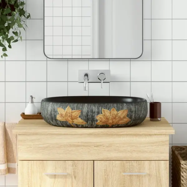 See tööpinnale paigaldatav ovaalne keraamiline valamu on stiilne ja ajatu valik igasse vannituppa, pesuruumi või tualettruumi. Halli ja musta tooniga pind ning peened mustrid annavad ruumile iseloomu, samal ajal kui vastupidav keraamika tagab pika kasutusea ja lihtsa hoolduse.