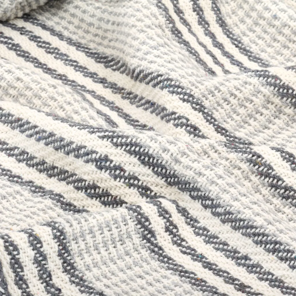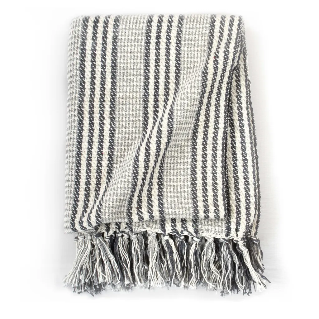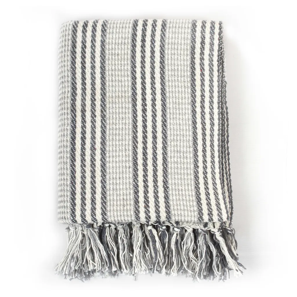 See 100% puuvillane pleed lisab diivanile, voodile või tugitoolile lisasoojust ja visuaalset pehmust. Hall-valge triibuline muster ja dekoratiivsed tutid loovad rahuliku meeleolu ning sobituvad hõlpsalt erinevate sisustusstiilidega.