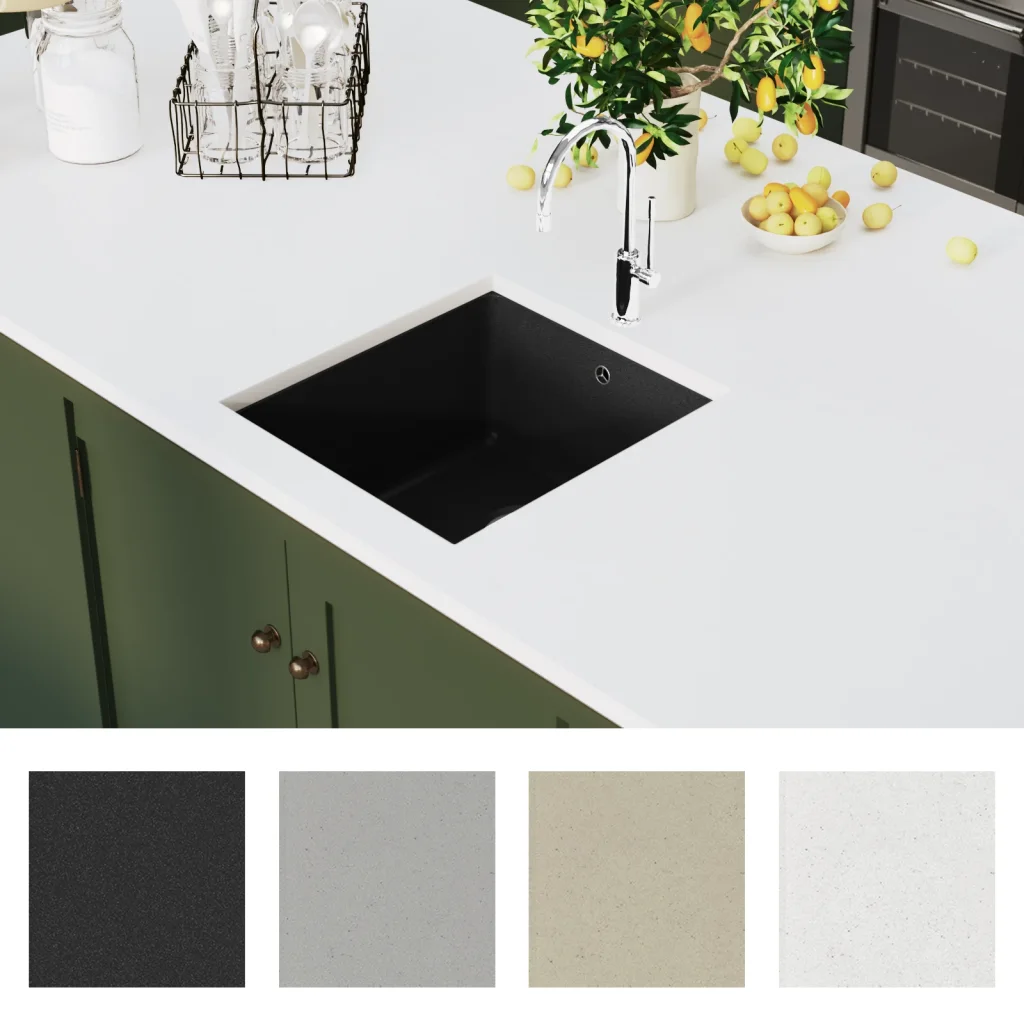 - Vastupidav graniitkomposiit koosneb 80% kvartsist ja 20% vaigust, pakkudes tugevat ja tihedat pinda igapäevaseks kasutuseks.