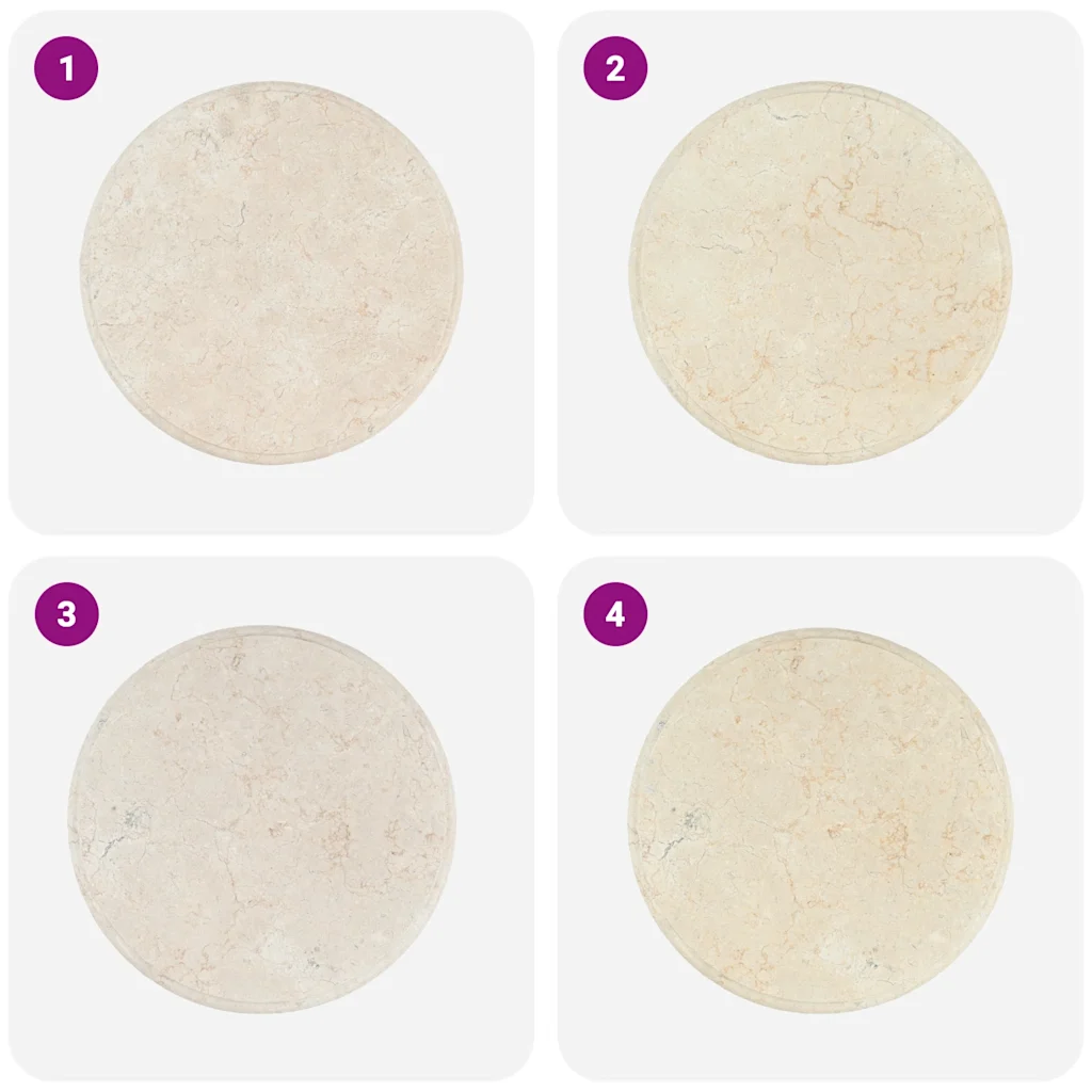 • 1 kreemjasvalge marmorist ümar lauaplaat mõõtudega 50 x 2,5 cm (läbimõõt x kõrgus)