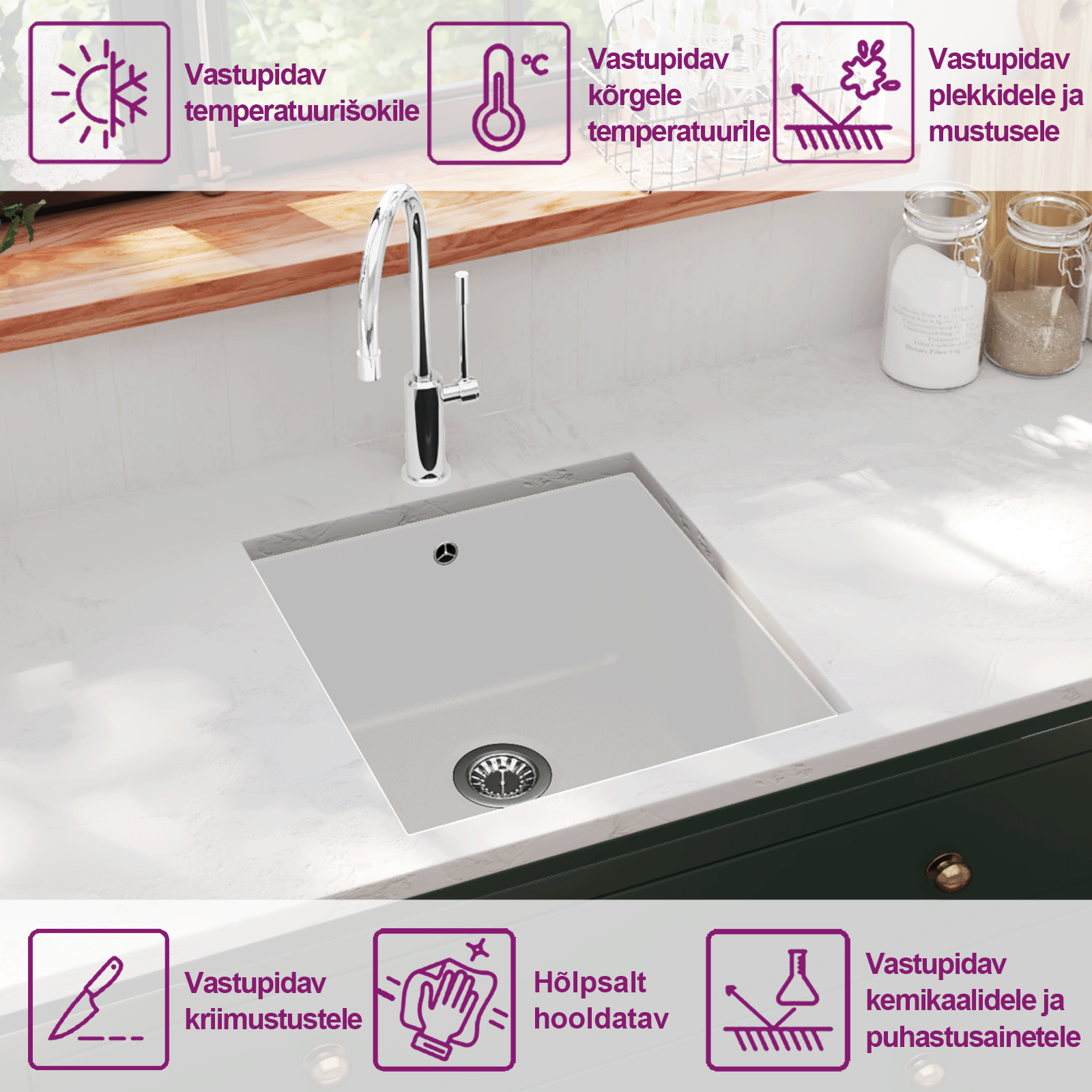 Kui soovid köögivalamut, mis ühendab vastupidavuse, praktilise sügavuse ja neutraalse disaini, on see mudel hea valik. Kuuma-, pleki- ja kriimustuskindel pind sobib aktiivsesse kööki, aluspaigalduse lahendus hoiab tööpinna ühtlase ja kergesti puhastatavana ning komplektis olev korvisõel muudab äravoolu hoolduse lihtsamaks.