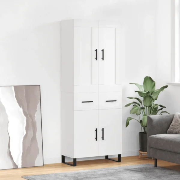 See valge kõrge kapp aitab hoida igapäevased esemed korrastatult ning sobib hästi elutuppa, esikusse või kodukontorisse. Tehispuidust korpus on sileda pinnaga, tugev ja niiskuskindel, mistõttu on kappi lihtne hooldada. Stabiilsust ja kaasaegset ilmet lisavad metallist jalad, mis tõstavad mööbli põrandast kõrgemale ja jätavad ruumi visuaalselt kergemaks.